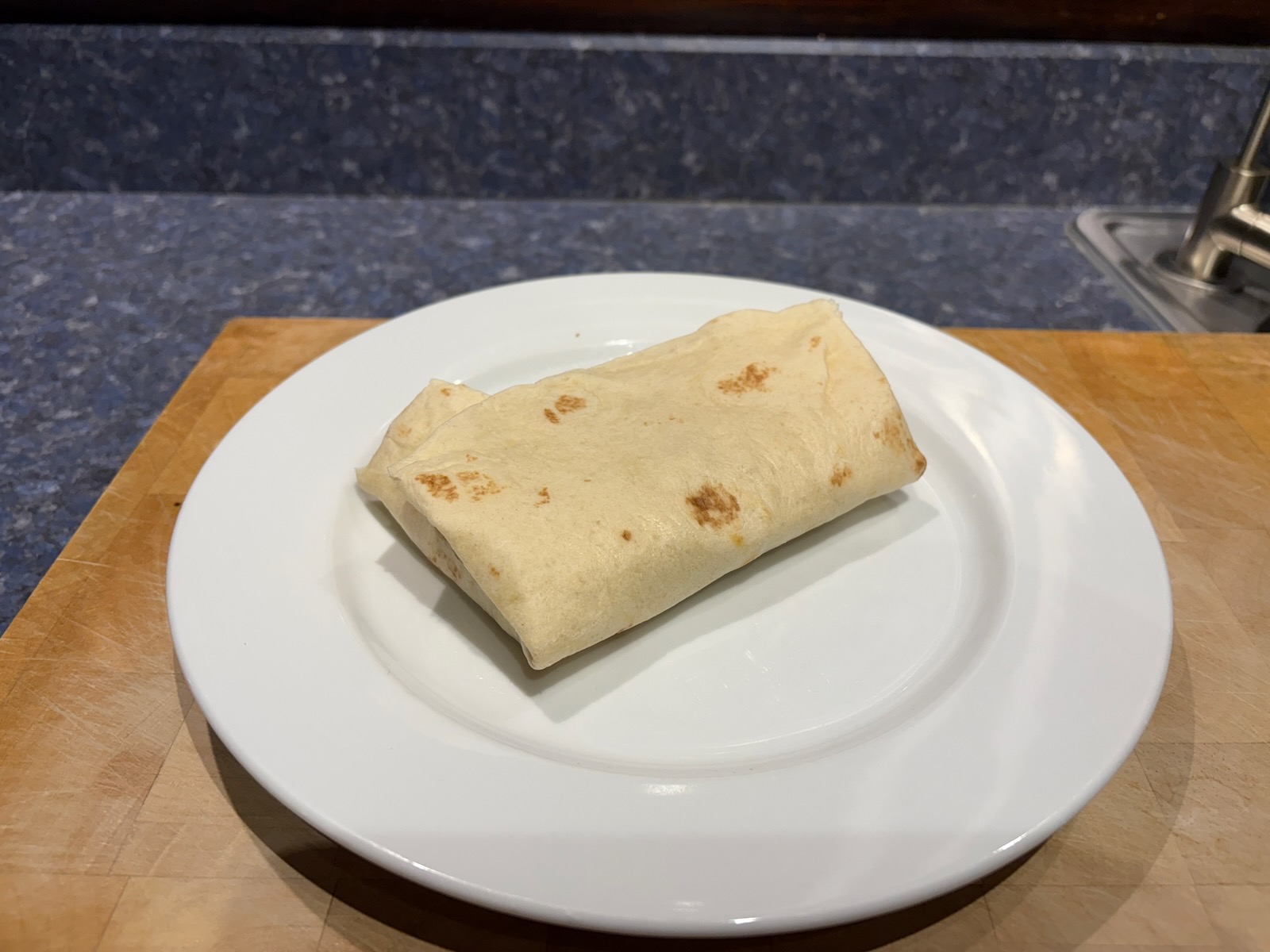 Breakfast: Chorizo breakfast burrito with chorizo, onion, green pepper, jalapeño, and egg. Reheat of the filling I cooked Saturday in a freshly heated flour tortilla.