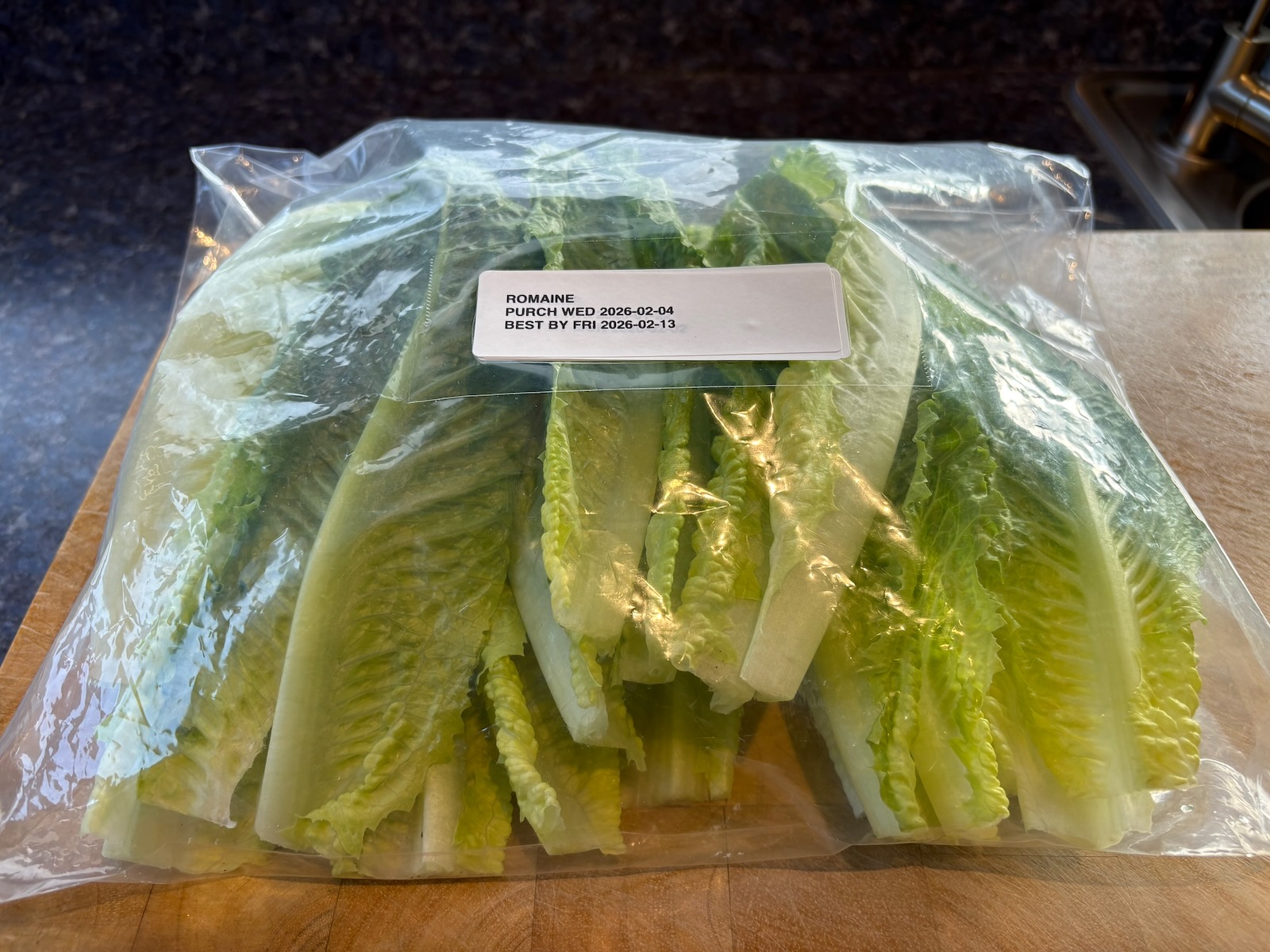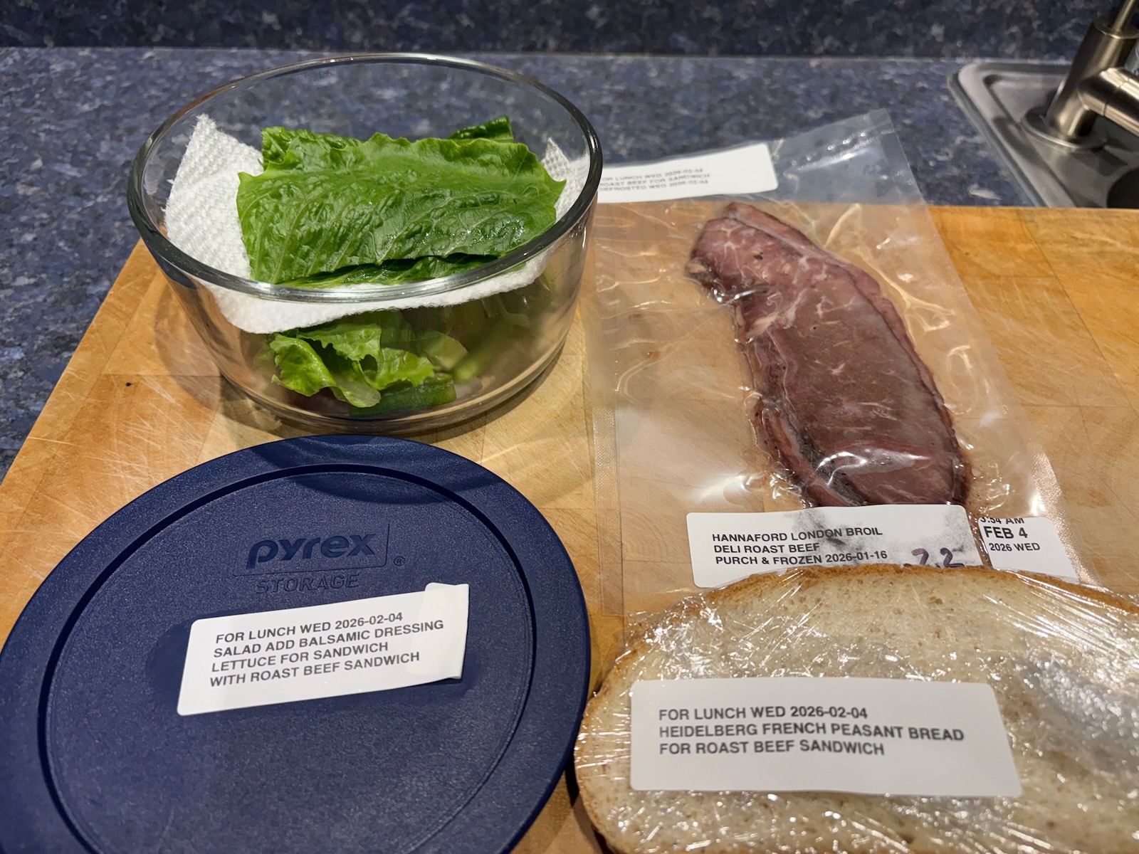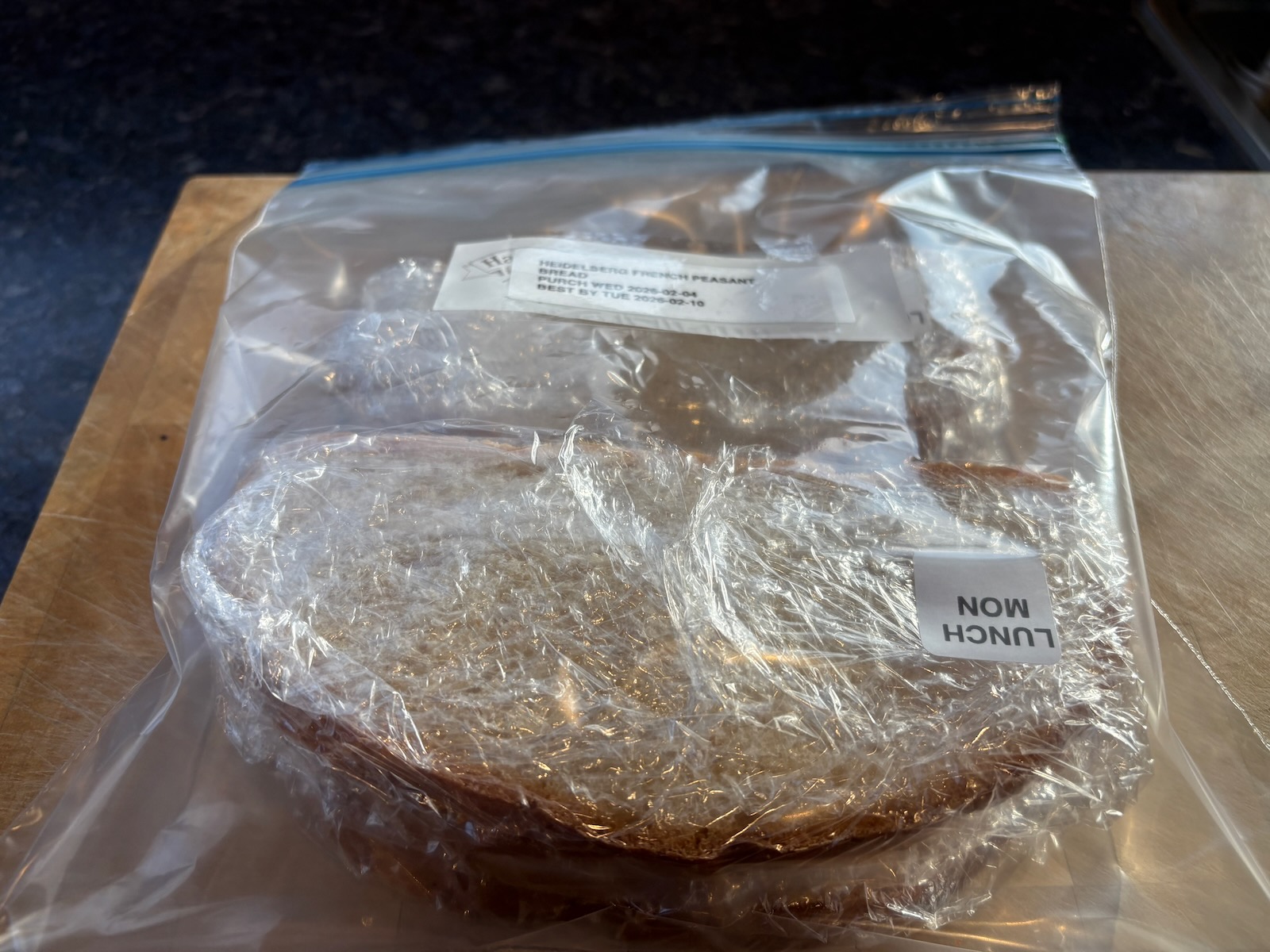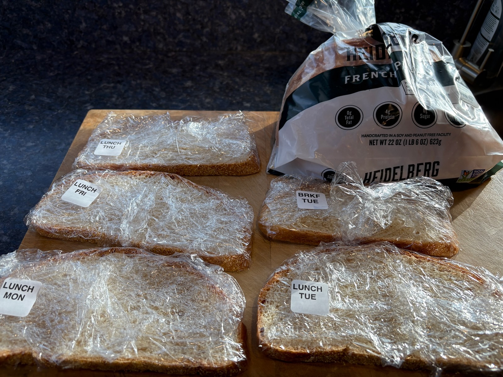 Divided a loaf of Heidelberg French peasant bread. Individually packaged servings through Tuesday and froze the rest of the loaf.