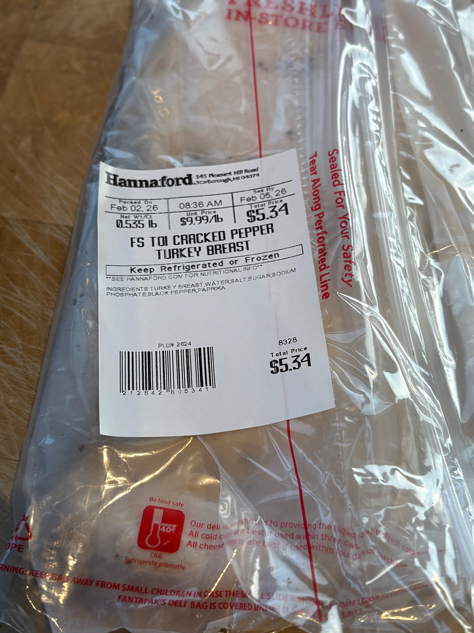 Divided a 0.535 lb. (8.5 oz) packaged of cracked pepper deli turkey into 4 servings of around 2.1 oz., vacuum sealed and frozen. Kept on refrigerated for lunch tomorrow.