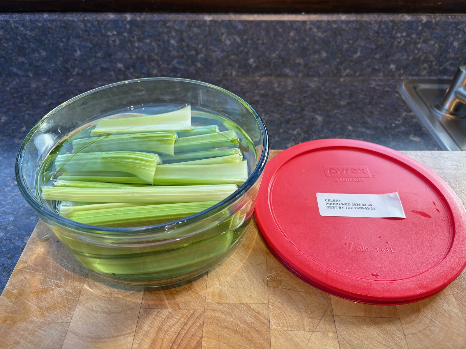 Prepped celery. Storing it in water and changing it every 4 days worked well. Good until Tuesday 2026-02-24.