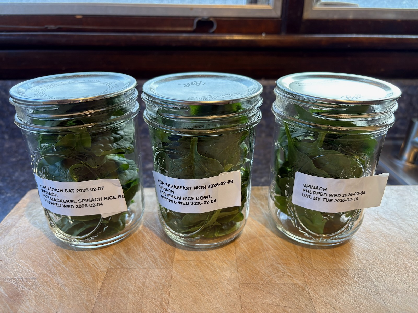 Prepped, vacuum sealed, and refrigerated jars of spinach. Good until xxx.