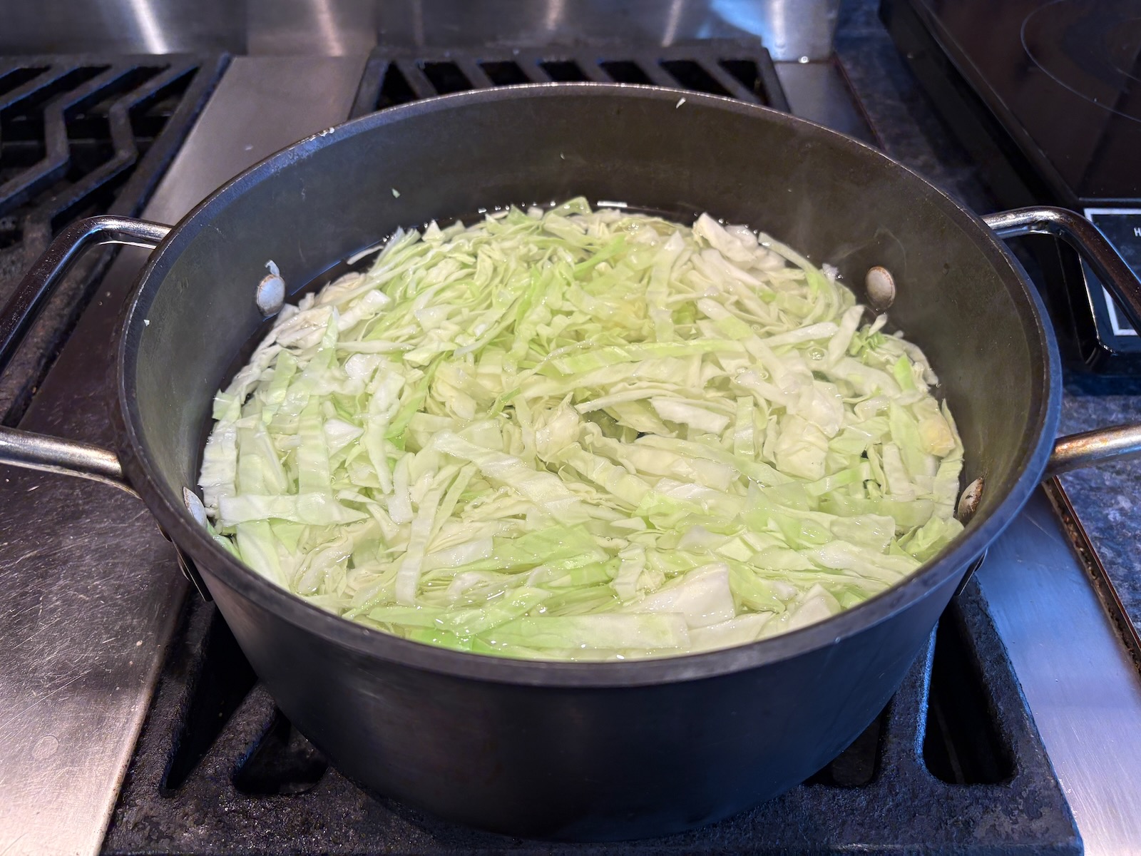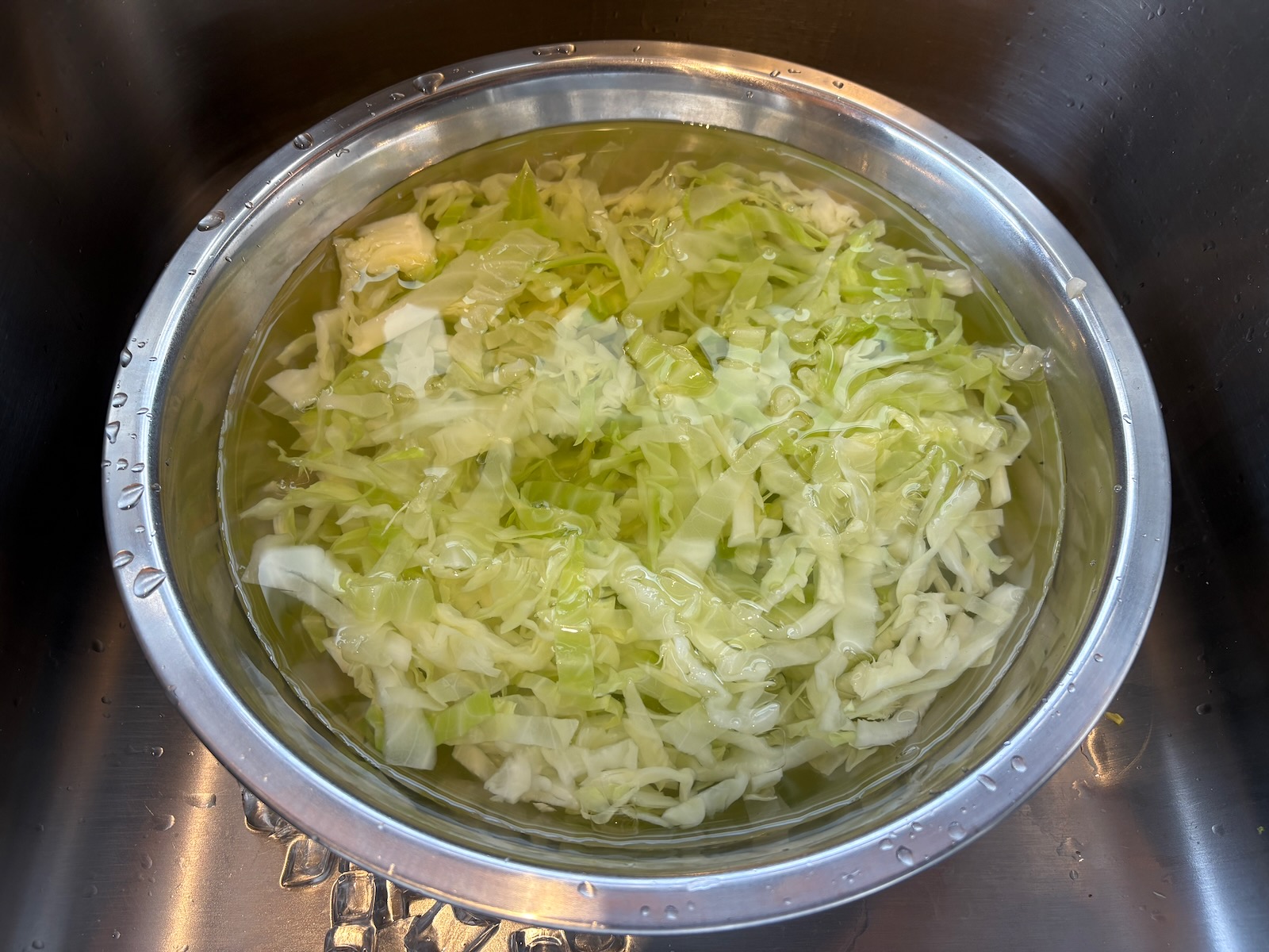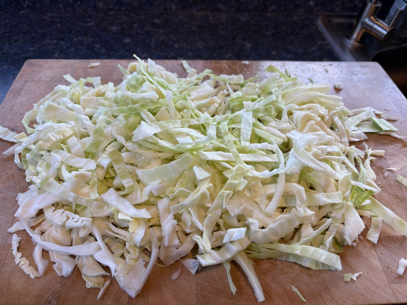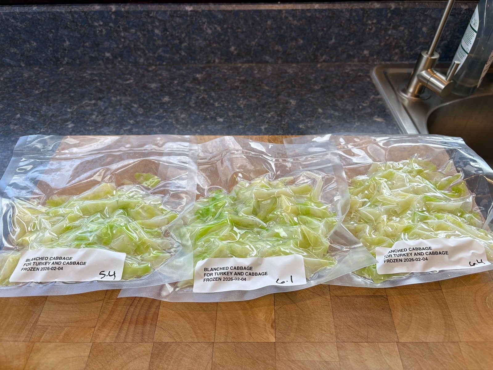 Tried freezing cabbage. The internet says to cut, blanch, shock in cold water, then vacuum seal and freeze. Raw cabbage and other cruciferous vegetables like broccoli can't be vacuum sealed raw because they release gases. We'll see how well it works when I try using it later for Turkey and cabbage stir-fry.
