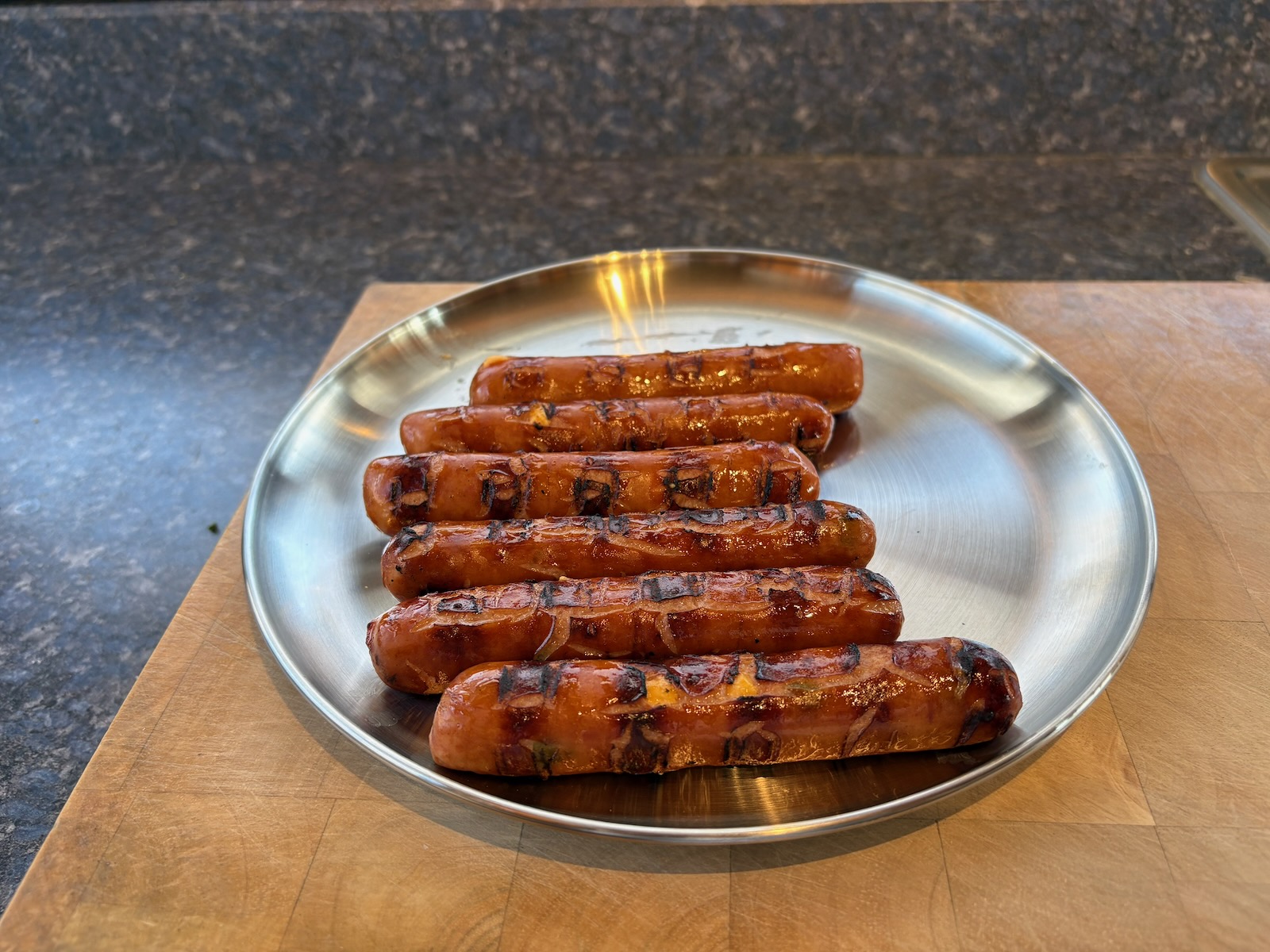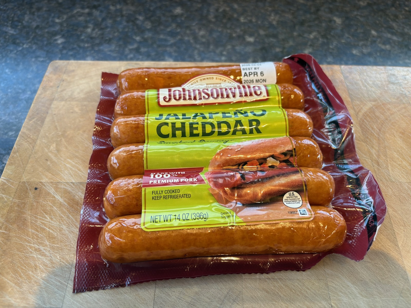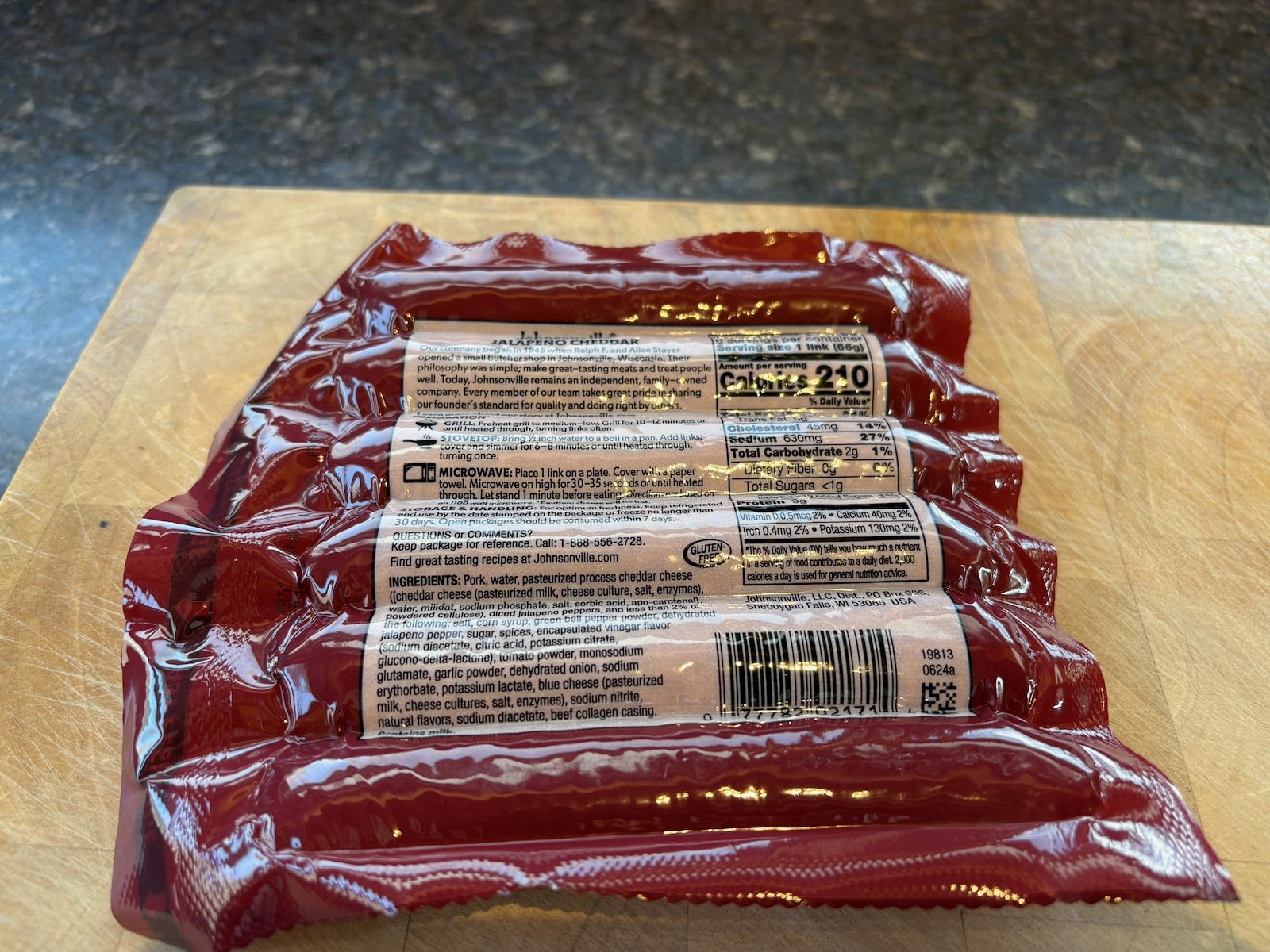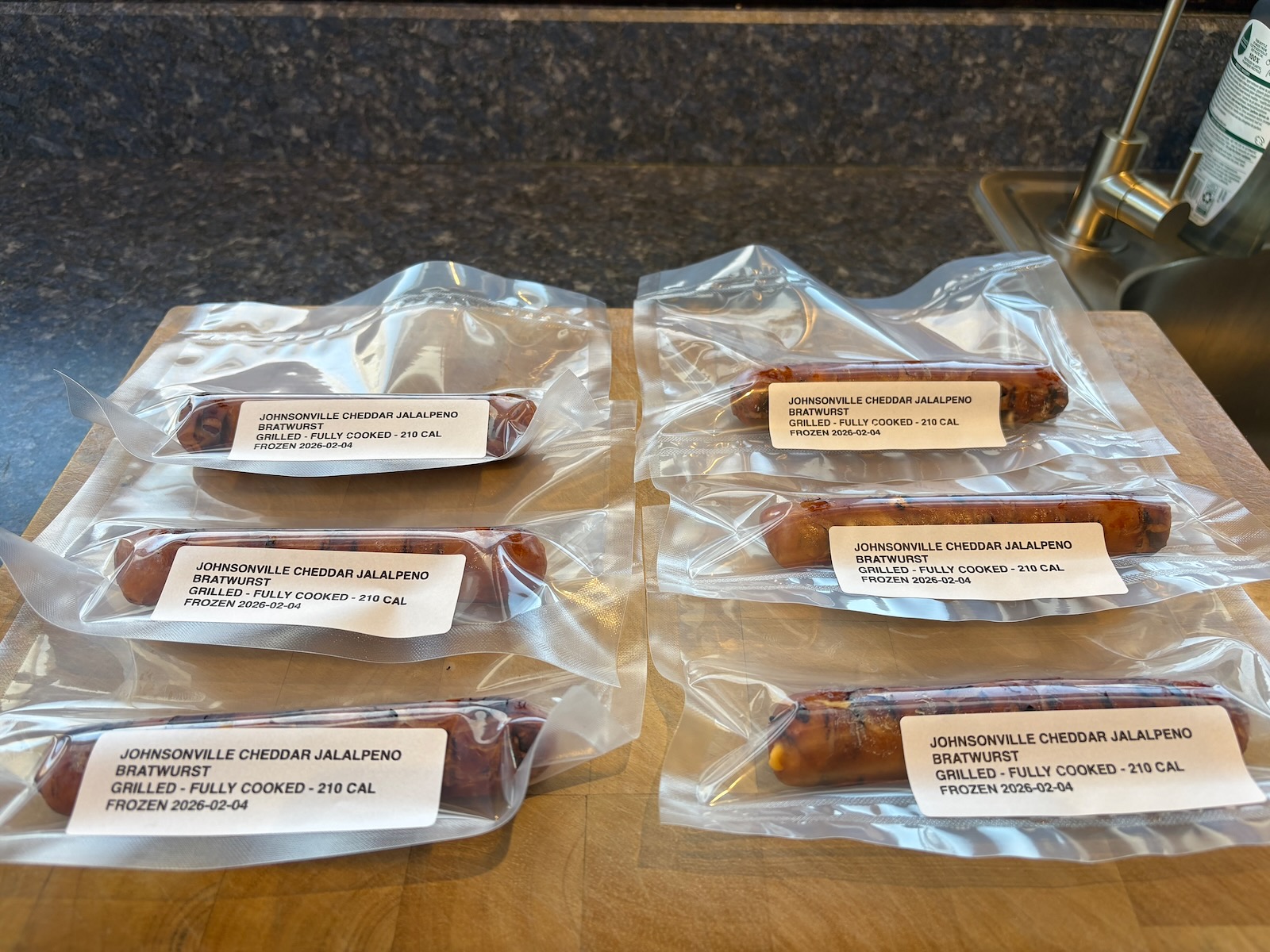 Grilled, vacuum sealed, and froze a package of Johnsonville jalapeño cheddar bratwurst. I used to get these all the time, but I never realized that they are 210 calories, without the bun!