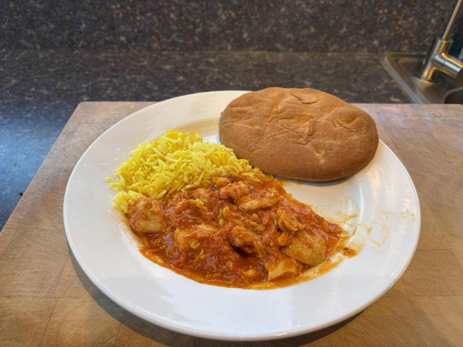 Dinner: Sukhi's frozen Indian, Butter chicken with naan and tumeric rice. Half a glass of Bota Box sauvignon blanc. I overcooked the naan, but the chicken and rice flavor was good.