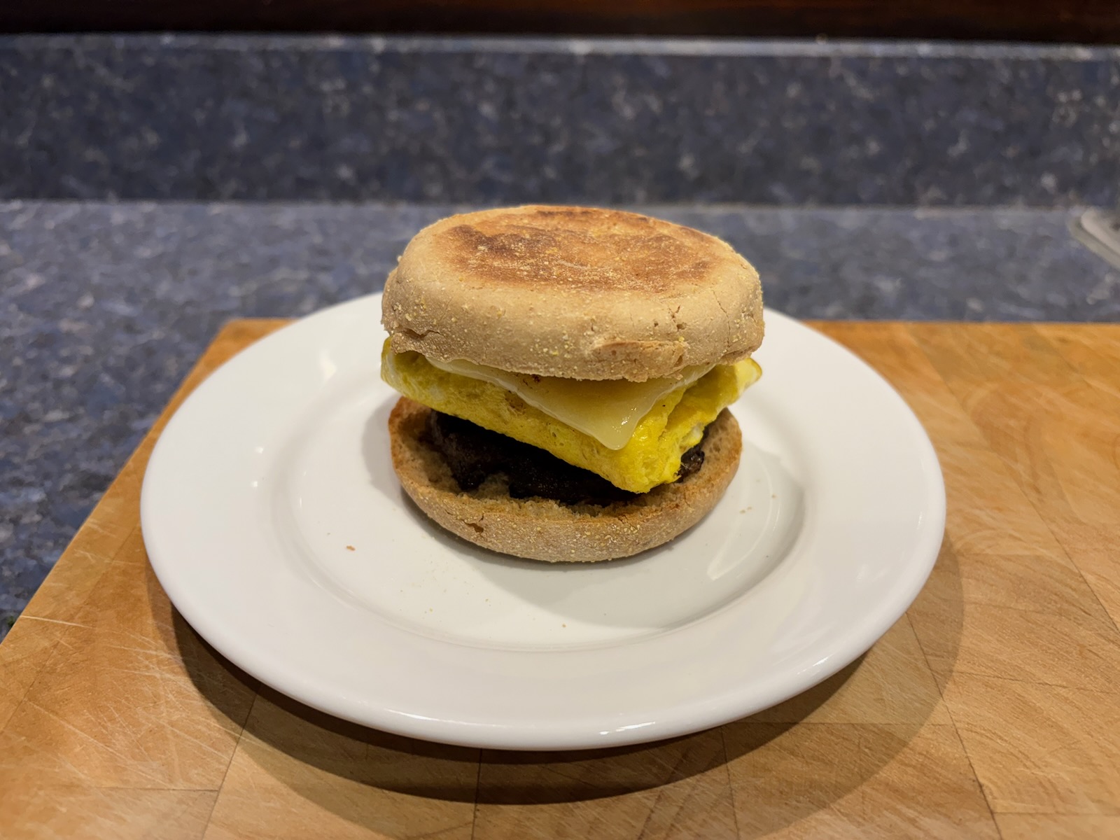 Breakfast: Sausage, egg, and cheese breakfast sandwich on wheat English muffin.