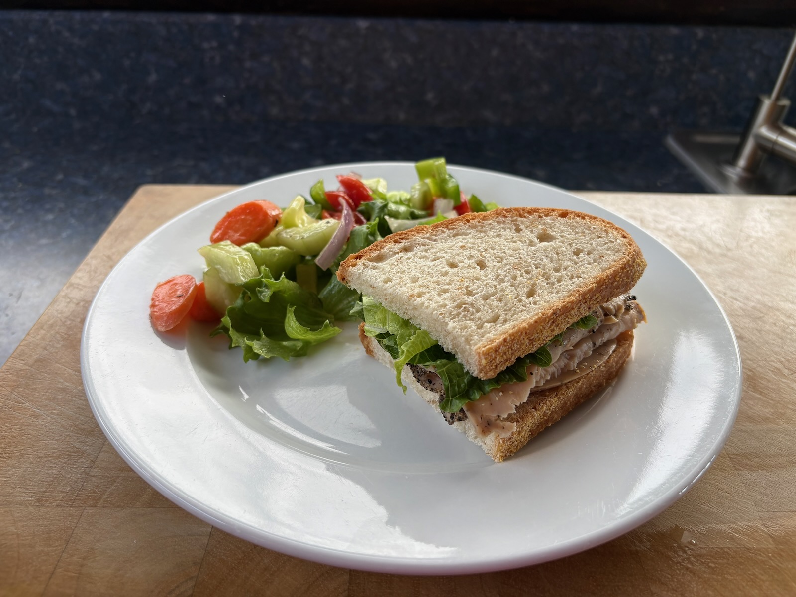 Lunch: Turkey sandwich with 2.1 oz. peppered deli turkey, lettuce, and mayo on Heidelberg French peasant bread. A side salad with lettuce mix, cucumber, tomato, and balsamic dressing.