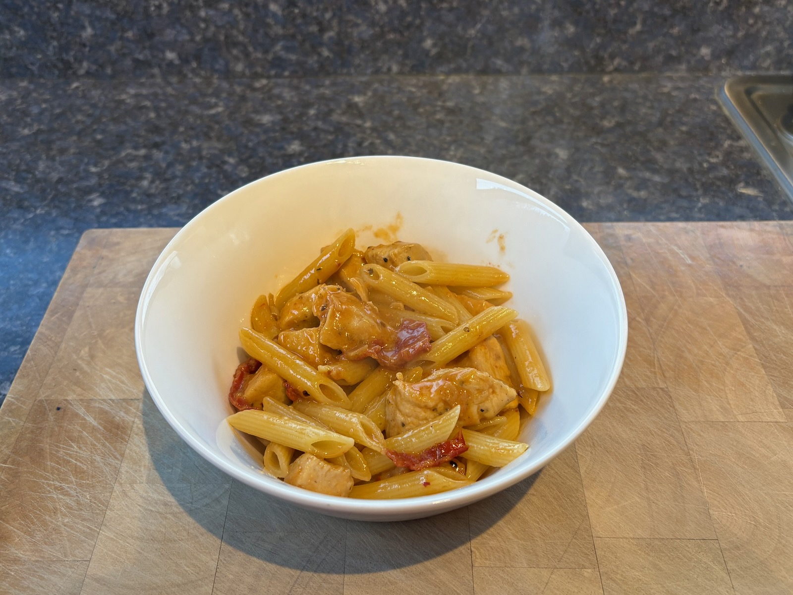 Dinner: Marry me chicken (6.7 oz). 1.8 oz. penne pasta. A glass of Bota Box cabernet sauvignon.