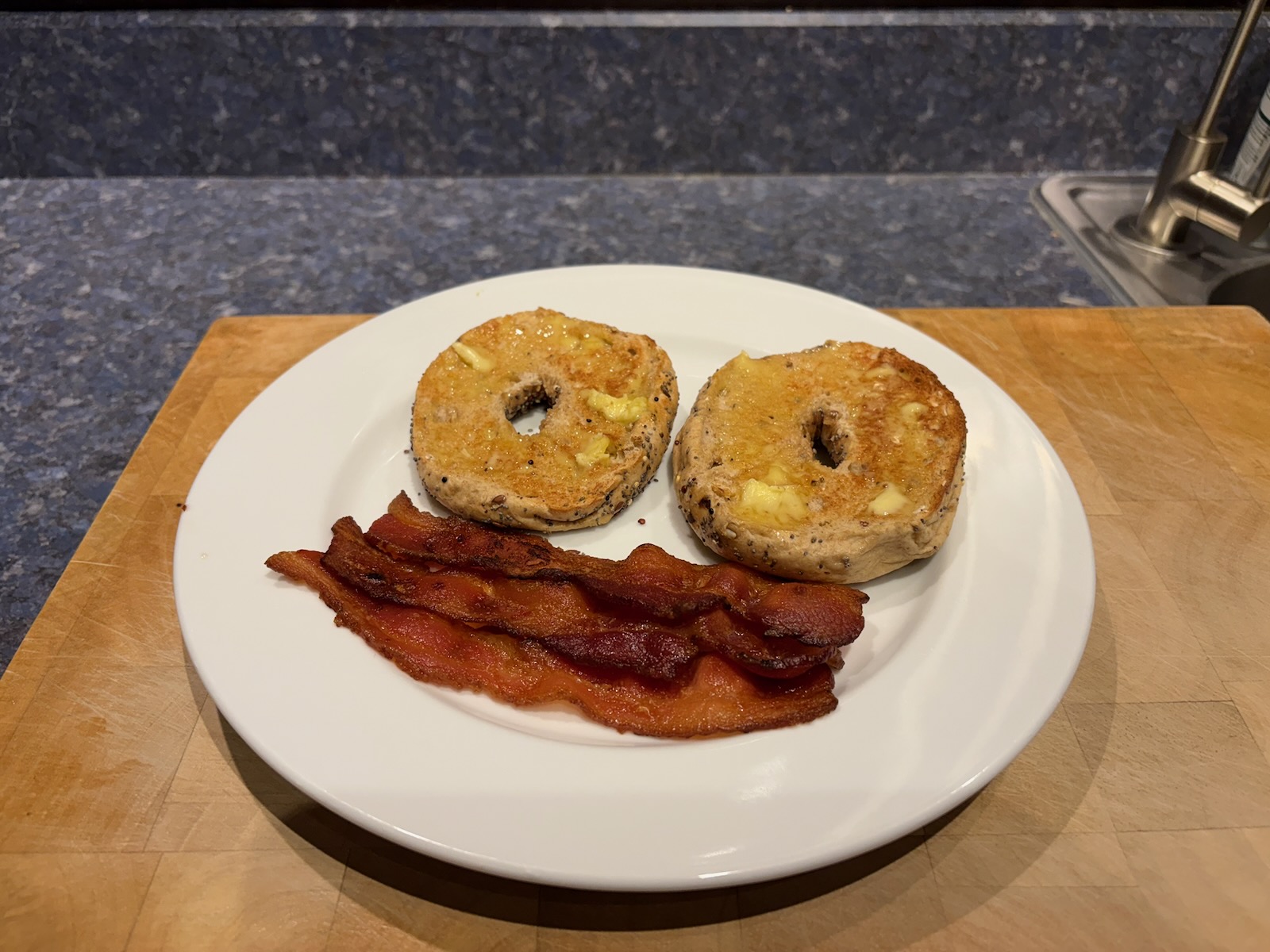 Breakfast: Toasted everything bagel with butter. Side of bacon.