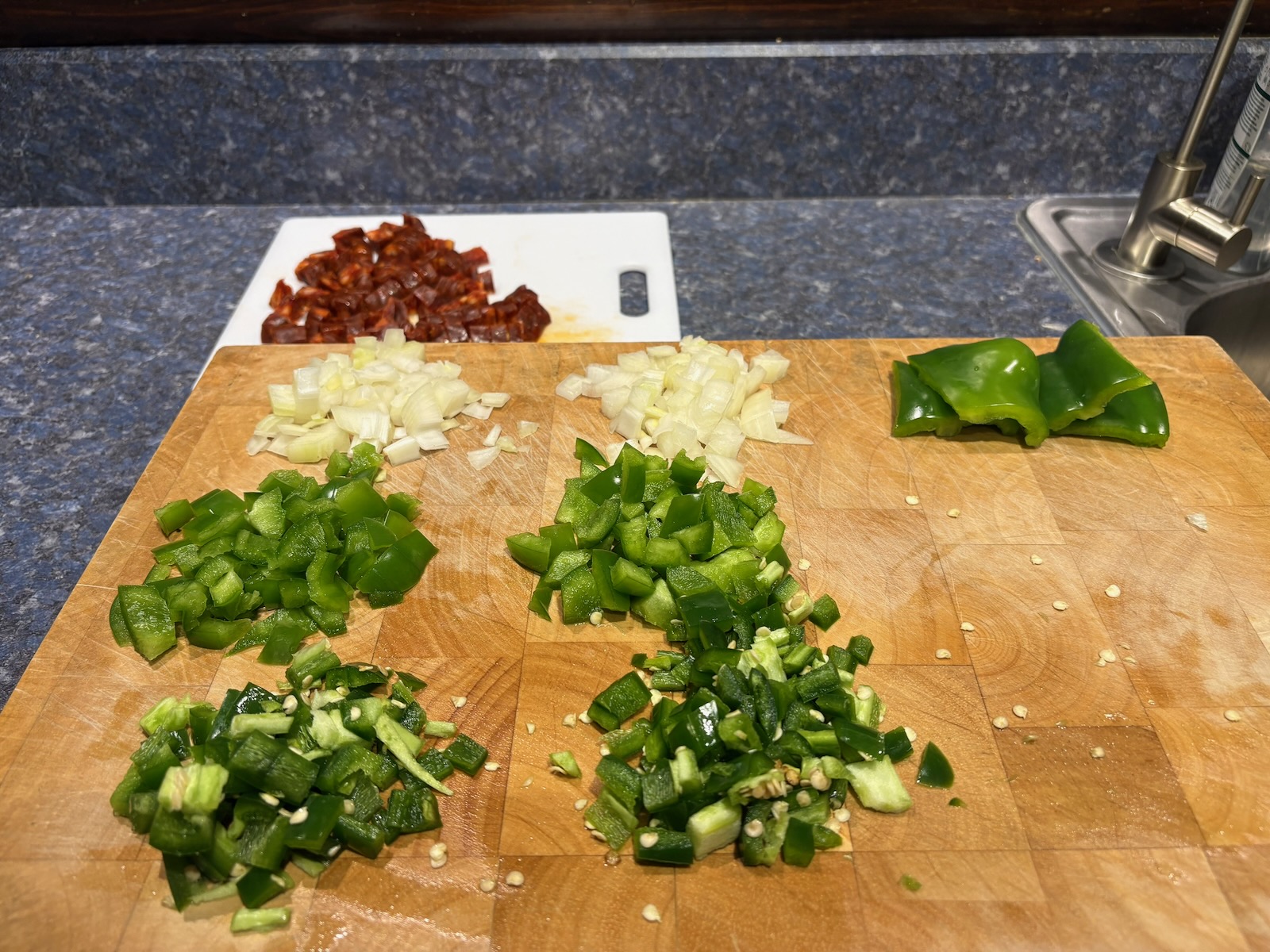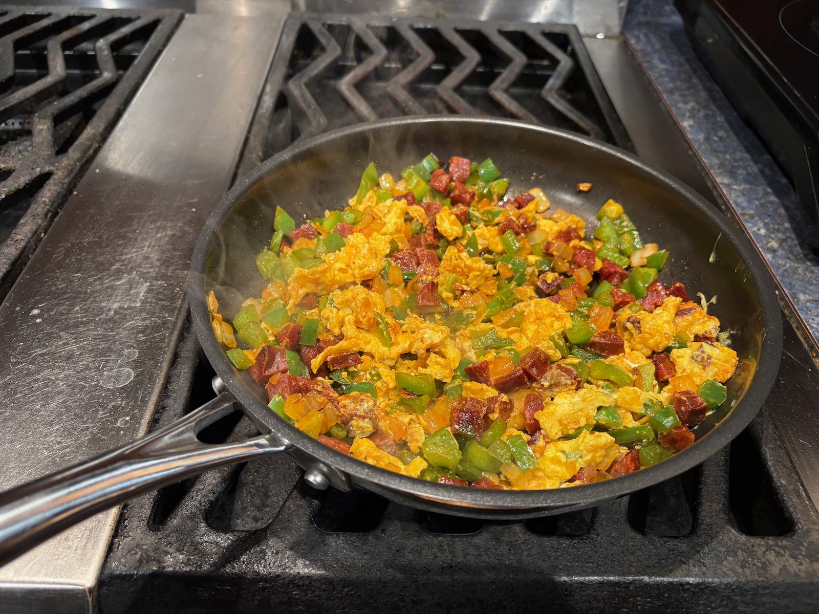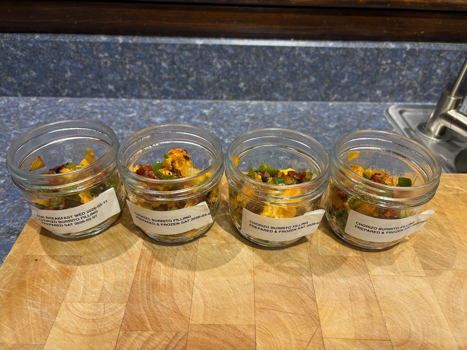 Made a double batch of the filling for chorizo breakfast burrito with chorizo, onion, green pepper, jalapeño, and egg for breakfast Wednesday. Froze 3 servings.