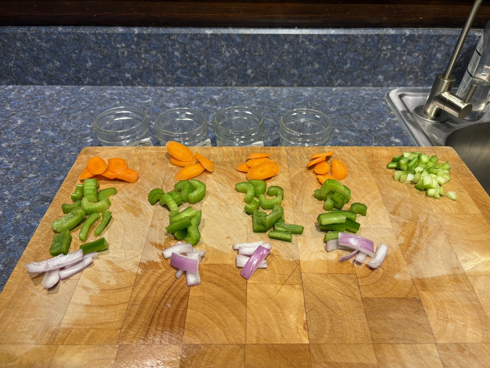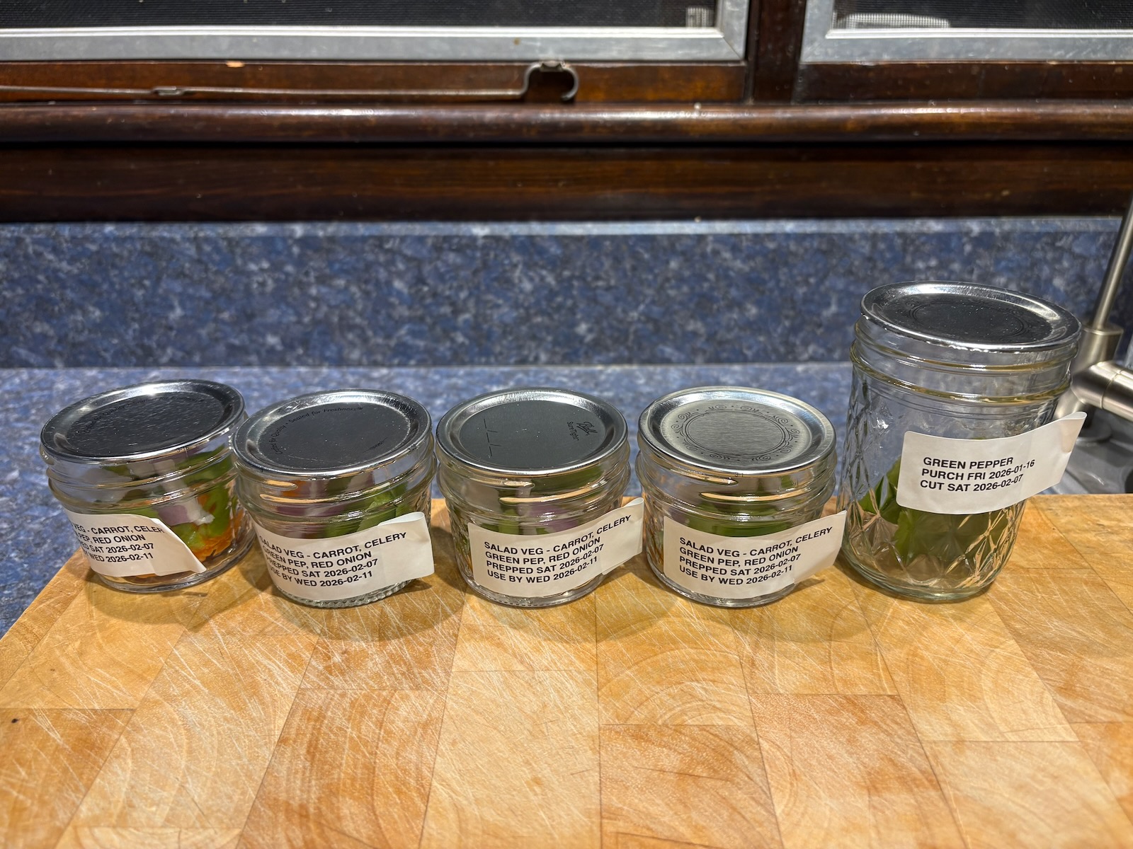 Prepped 4 servings of salad veggies. With carrot, celery, green pepper, red onion. Extra serving for Sunday.