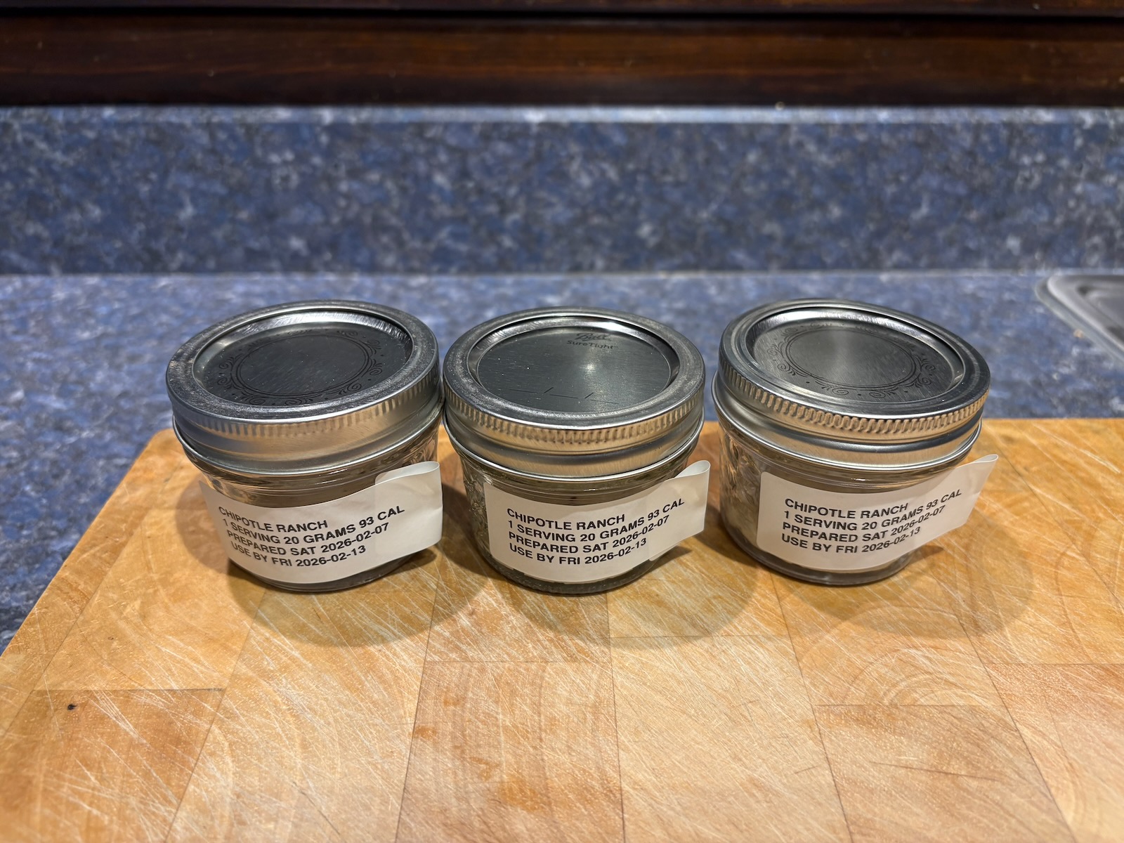 Prepped 3 servings of chipotle ranch salad dressing, 20 grams, 93 calories each. Extra serving for Sunday.