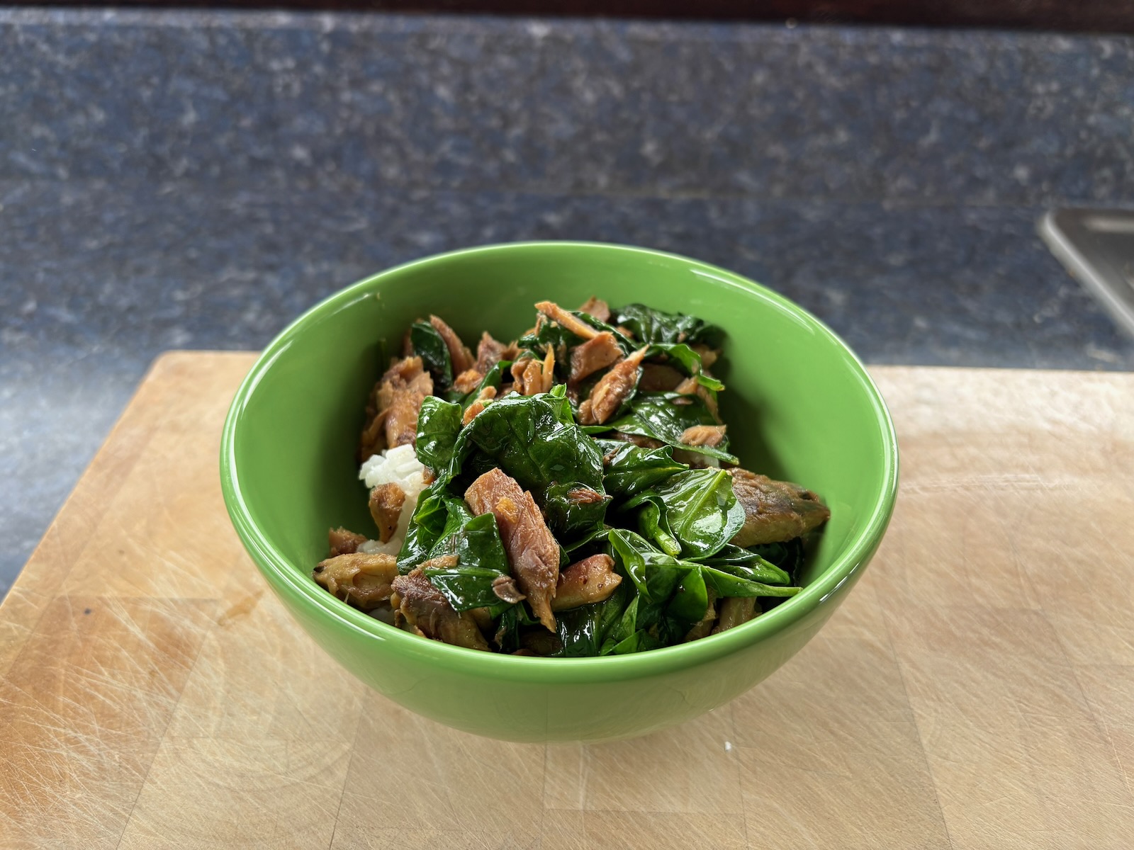 Lunch: Mackerel and spinach rice bowl #2. Half glass of Bota Box sauvignon blanc.