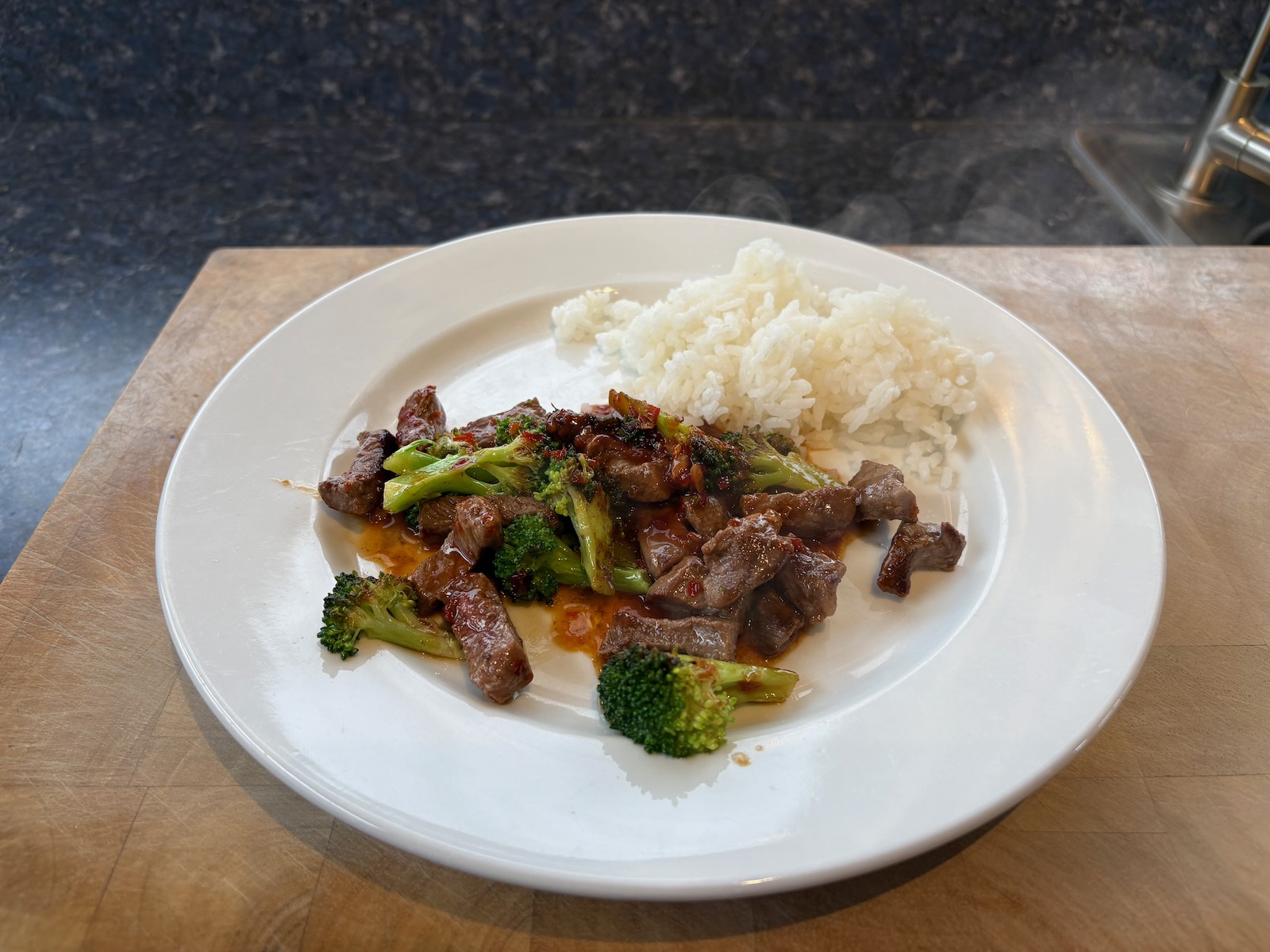 Dinner: Beef with broccoli #2. A half glass of Bota Box cabernet sauvignon.