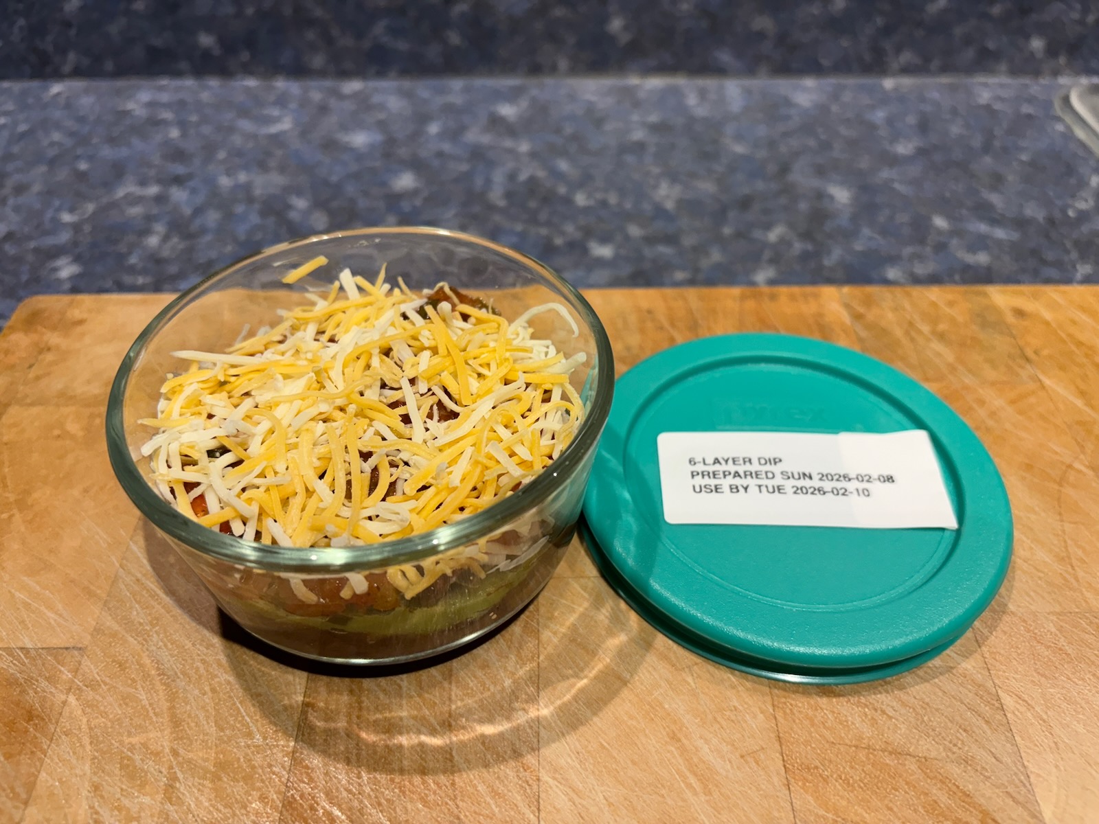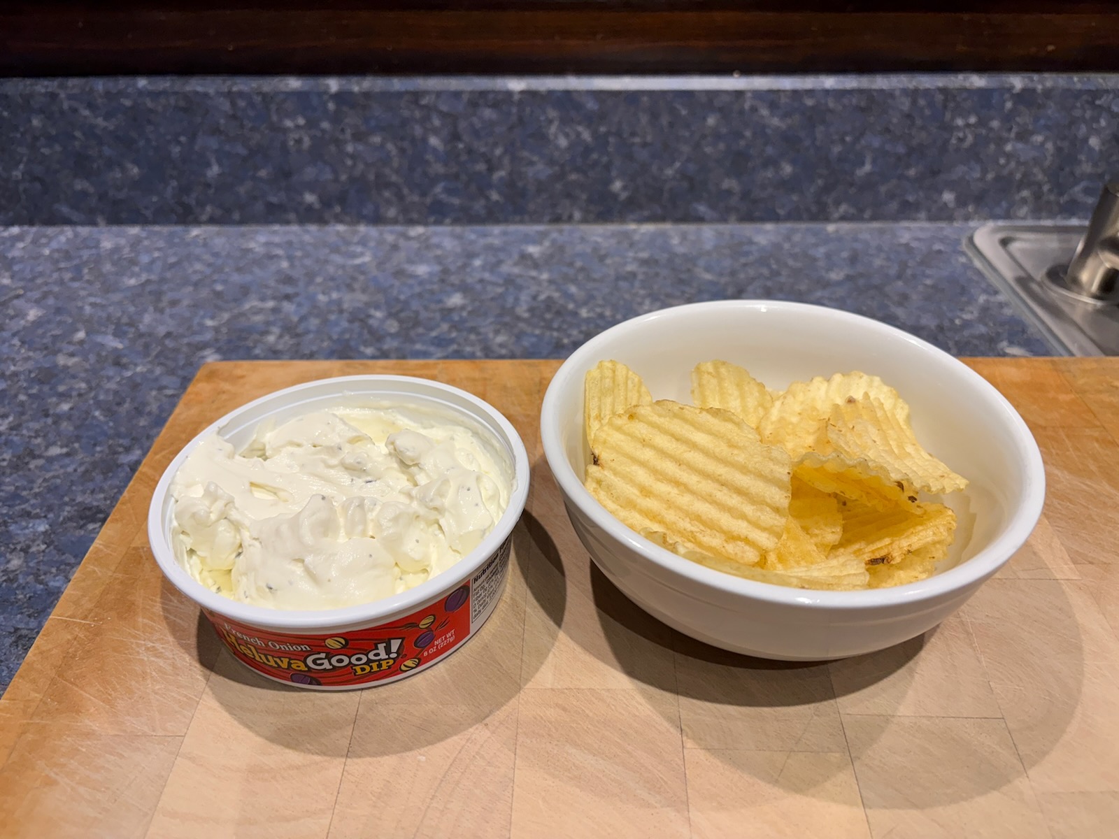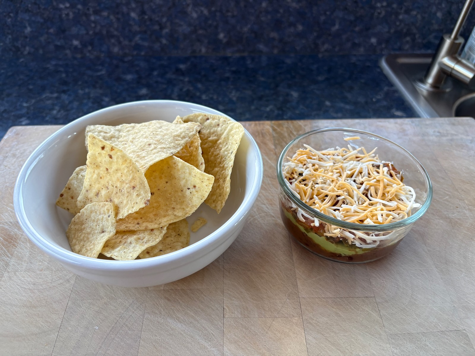 Snack: 6-layer dip. 1.0 oz. tortilla chips pictured; I had another bowl of 1.0 oz later.