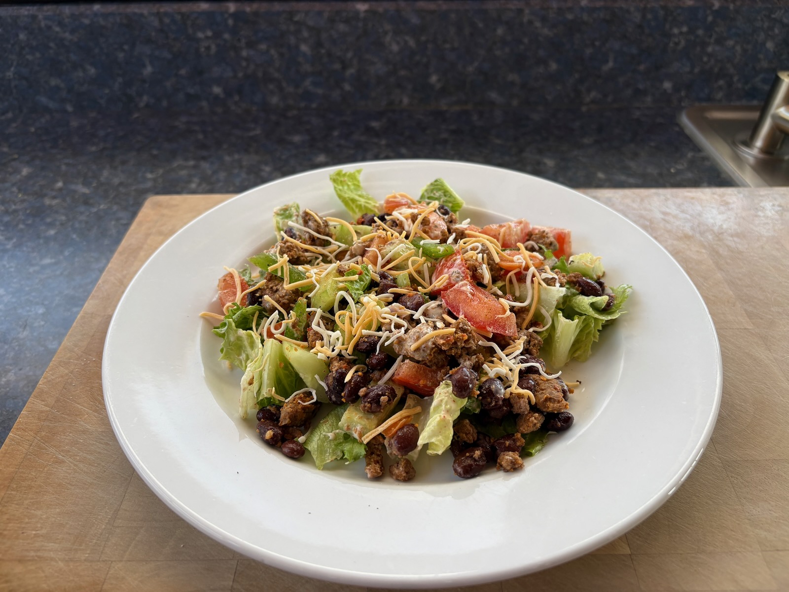 Lunch: Taco salad with 2.0 oz. taco seasoned ground beef, black beans, lettuce, cucumber, tomato, carrot, celery, green pepper, red onion, chipotle ranch dressing, and shredded Mexican 4 cheese blend. A sauza hornitos tequila on the rocks.