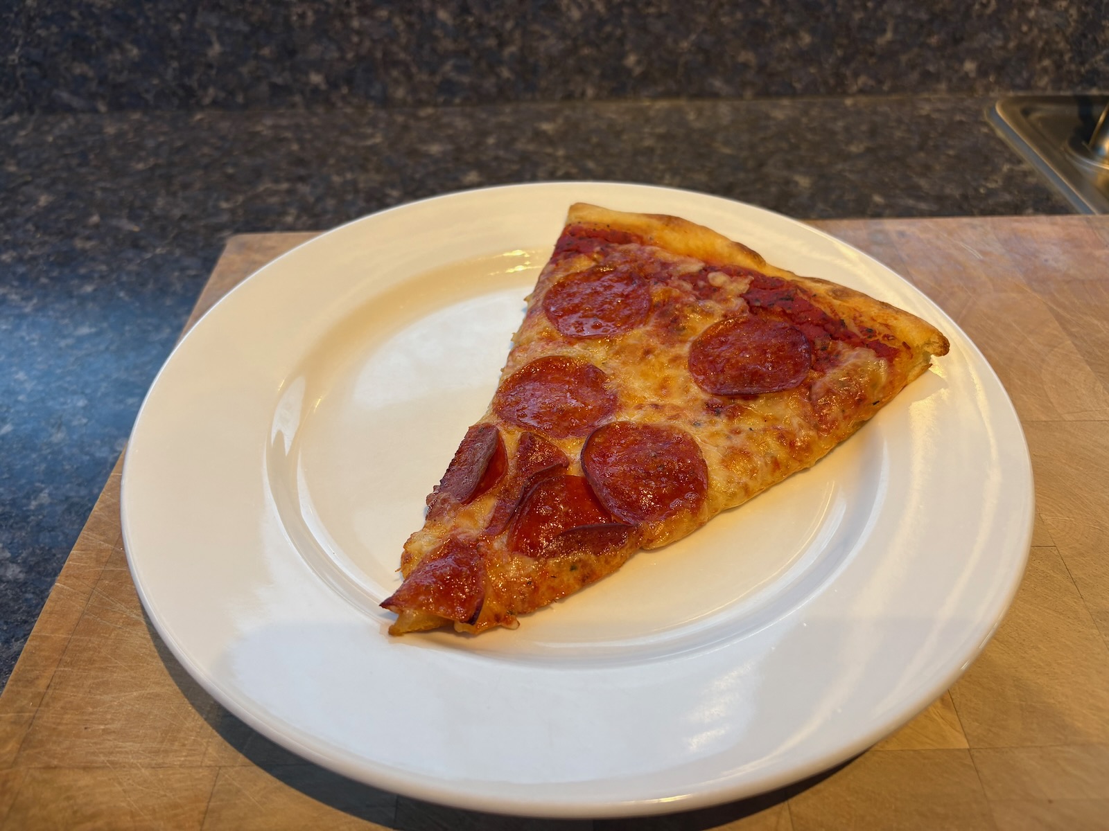 Dinner: 1 slice of Pepperoni pizza from Gavin's in Sidney, NY. It was vacuum sealed and frozen so I reheated it from frozen in the sous vide at 140°F, then transferred it to the Breville SmartOven, 400°F for 3 minutes, plus the preheat time, on a sheet pan. Half glass of Bota Box cabernet sauvignon.