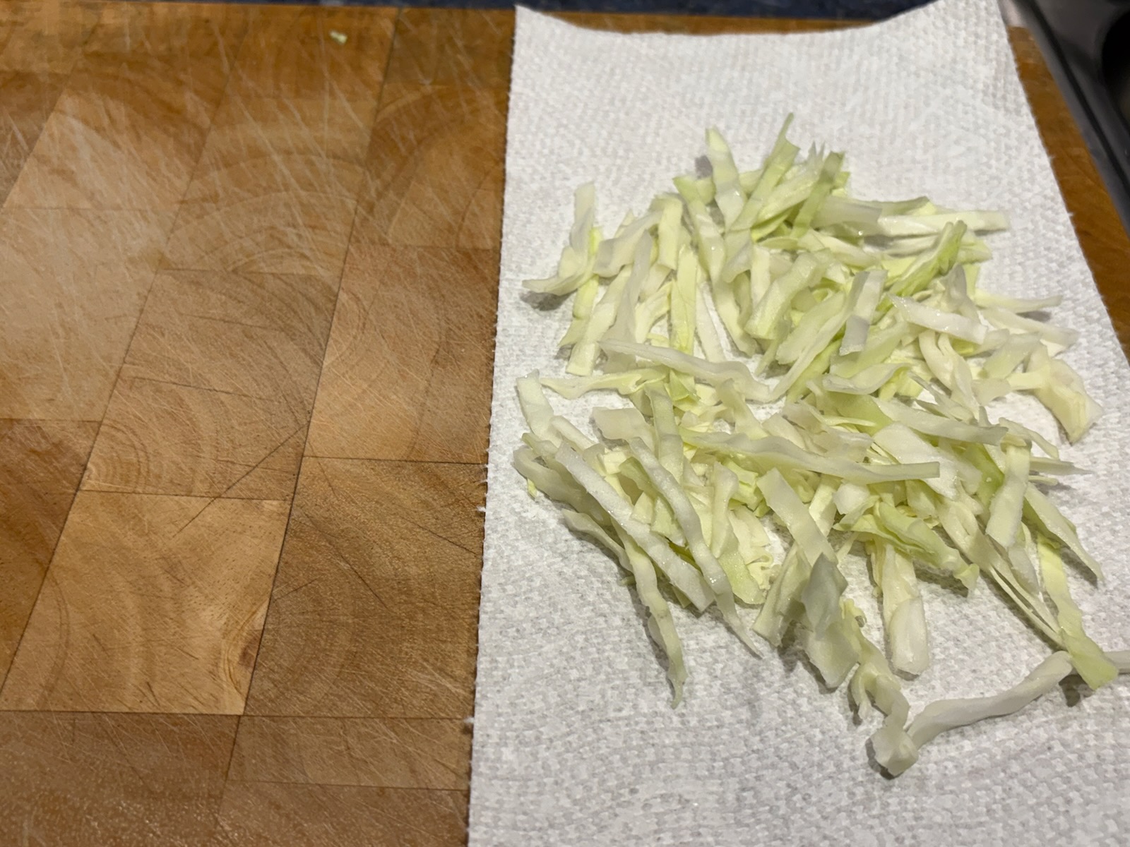 Thinly sliced green cabbage. Salted and let sit for 10 minutes.