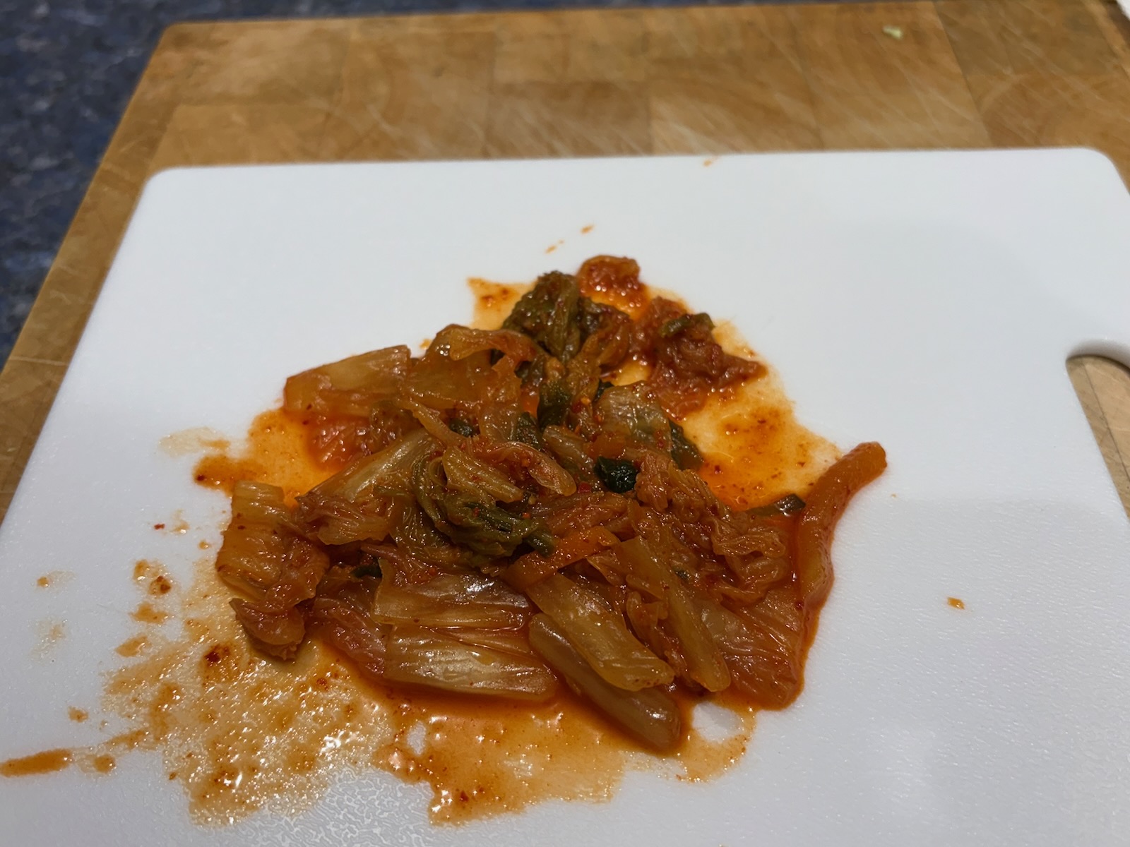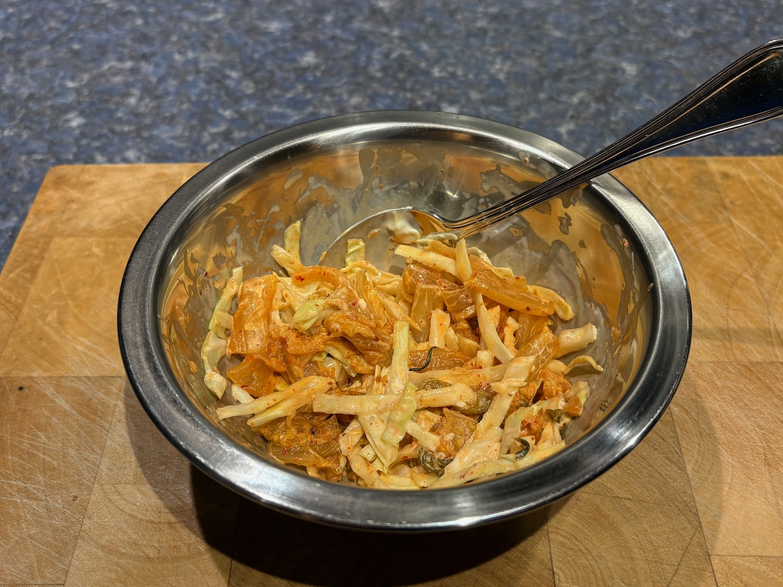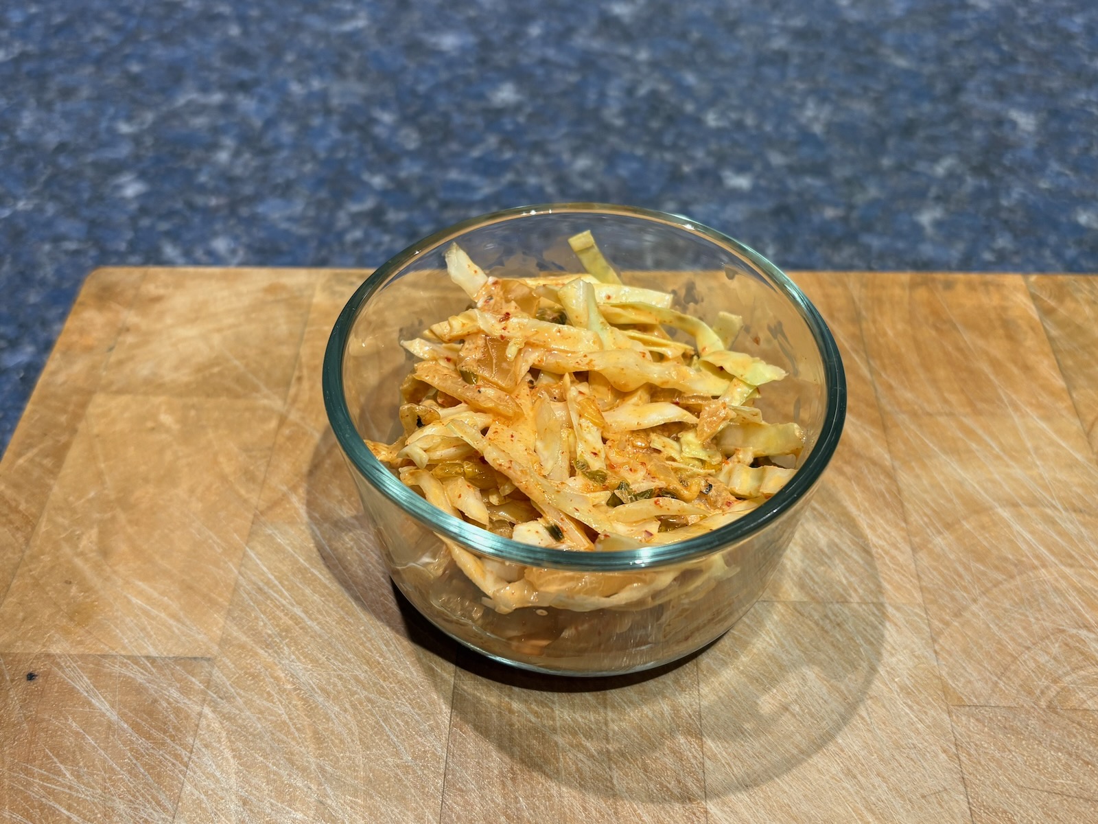 Toss the cabbage and kimchi, and refrigerate at least 20 minutes, up to a day.
