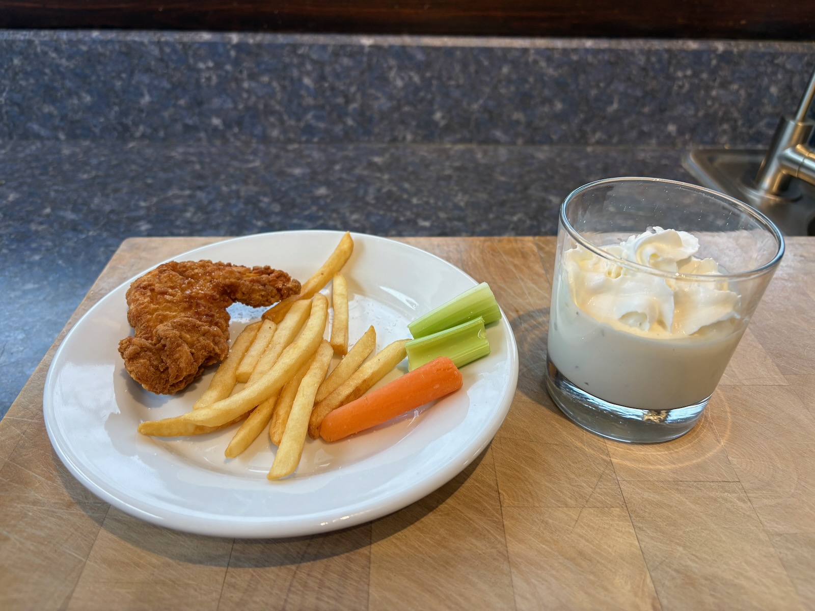 I was 90% certain it sounded horrible, but there was a small chance maybe it worked. I went to the store and got vanilla ice cream and made a milkshake, added ranch dressing, and topped it with whipped cream. I also made a chicken strip, on the off chance it's like chicken and waffles and it's the salty and sweet thing. I also made a few French fries it case it's like the fries and Wendy's frosty salty and sweet thing. And celery and carrot.