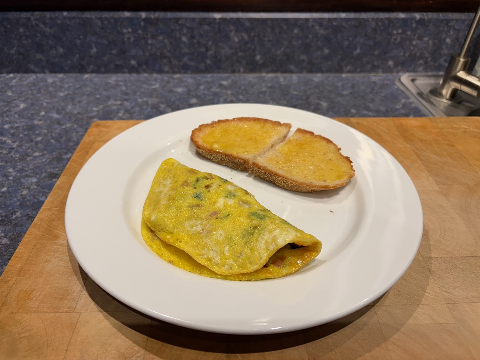 Breakfast: Spicy western omelette. Filling cooked Sunday and reheated, in 1 egg, freshly cooked. And Heidelberg French peasant bread toast with butter.