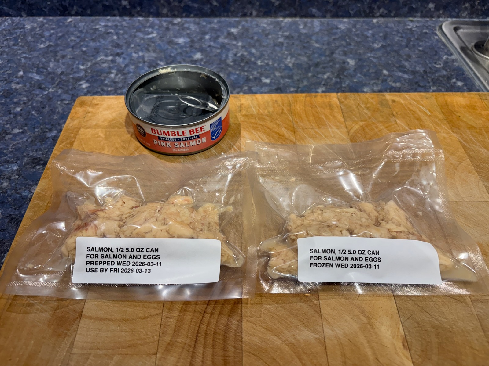 Dinner: Salmon and eggs stir-fry with spinach. A half glass of Bota Box sauvignon blanc.
