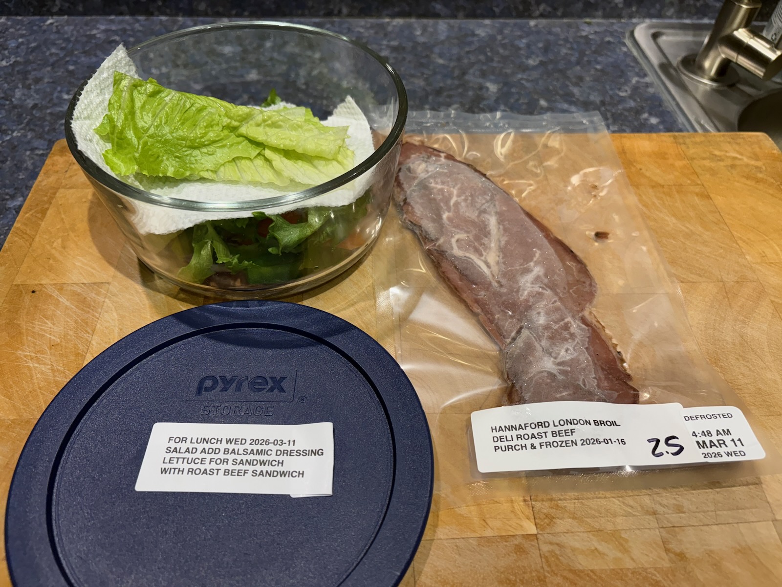Lunch: Roast beef sandwich. With 2.5 oz. deli roast beef, lettuce, horseradish, and mayo on Heidelberg French peasant bread. Salad with lettuce mix, cucumber, tomato, carrot, celery, green pepper, red onion, and balsamic dressing.