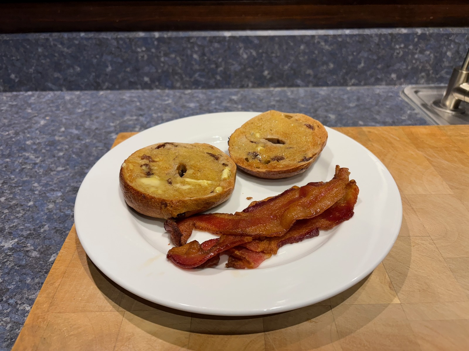 Breakfast: Toasted blueberry bagel with butter. Side of bacon.