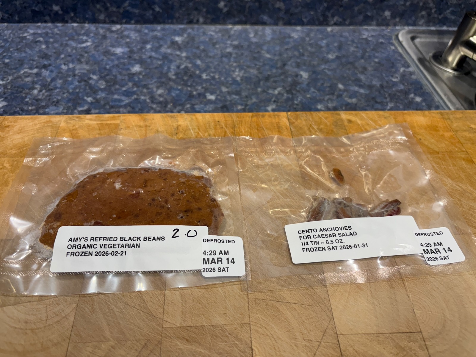 Defrosted refried black beans for breakfast tomorrow. And anchovies for Caesar salad tomorrow.
