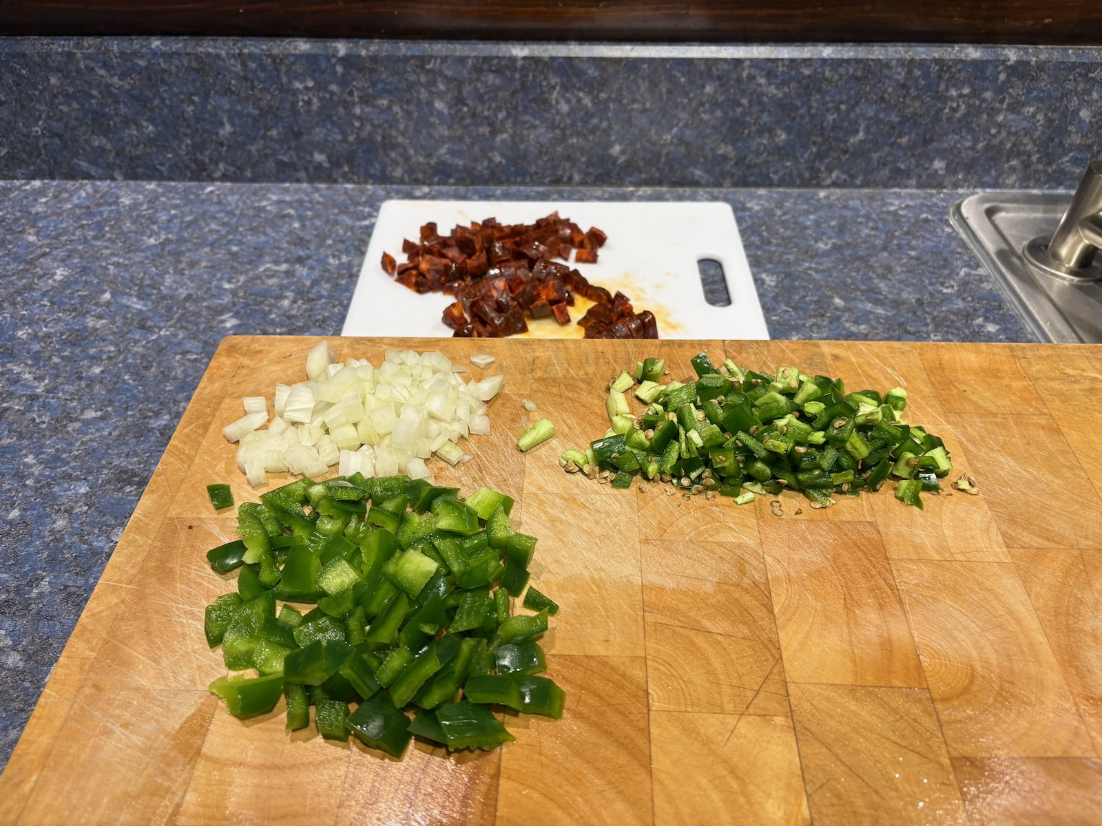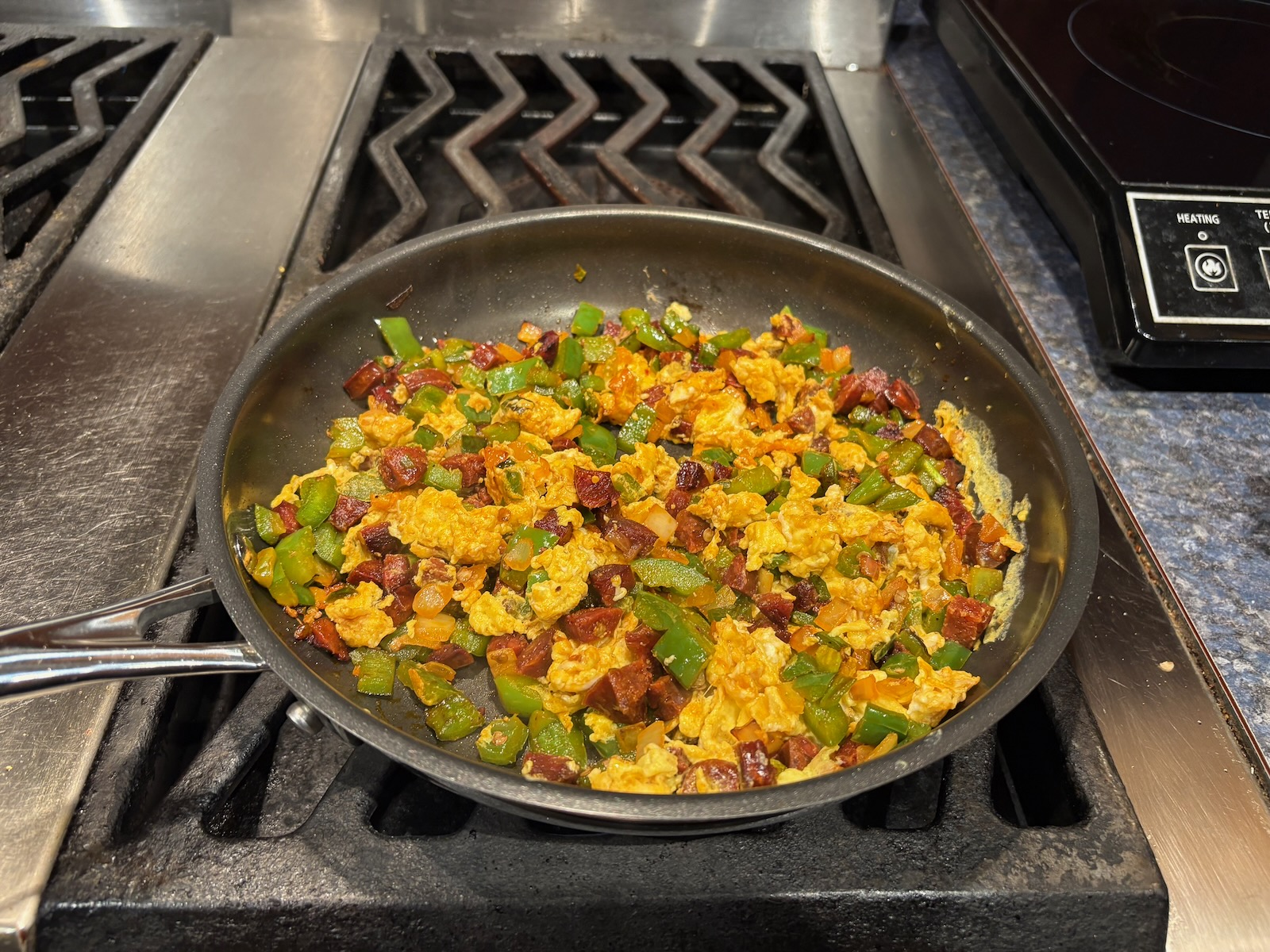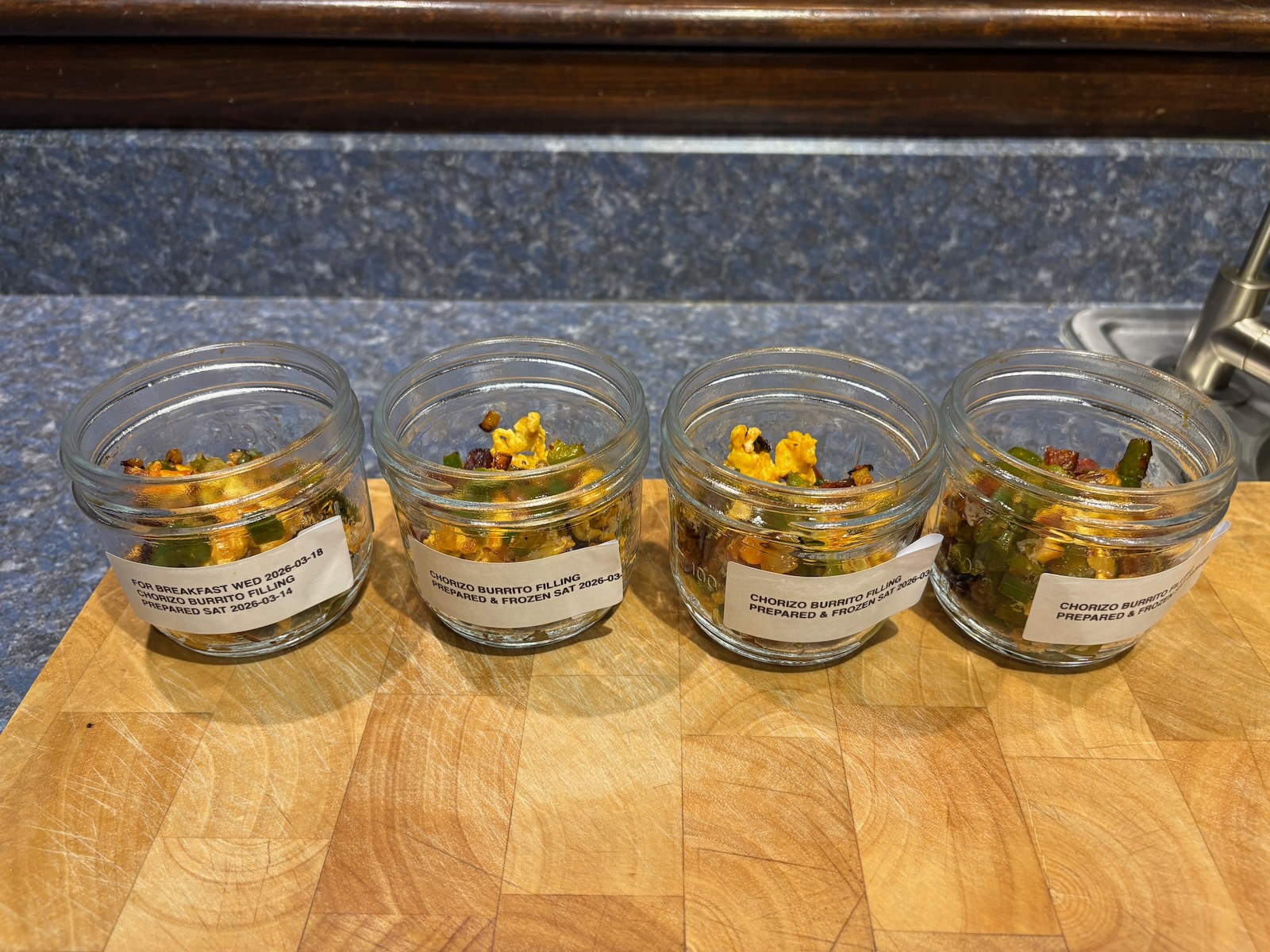 Made a double batch of the filling for chorizo breakfast burrito with chorizo, onion, green pepper, jalapeƱo, and egg for breakfast Wednesday. Refrigerated one serving for Wednesday and froze 3 servings.