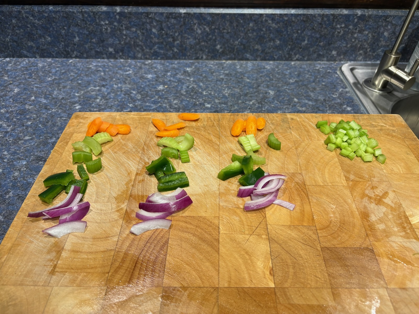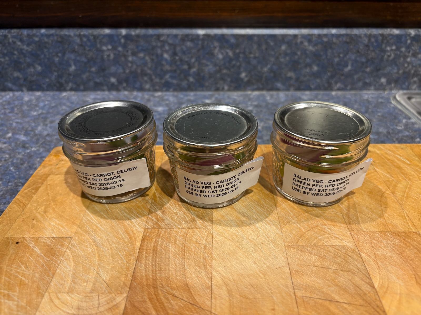 Prepped 3 servings of salad veggies. With carrot, celery, green pepper, red onion.