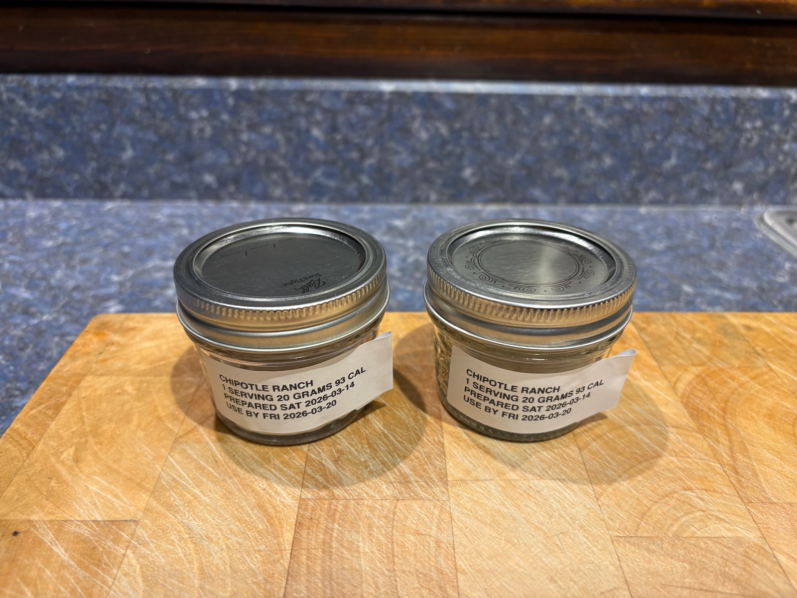 Prepped 2 servings of chipotle ranch salad dressing, 20 grams, 93 calories each.
