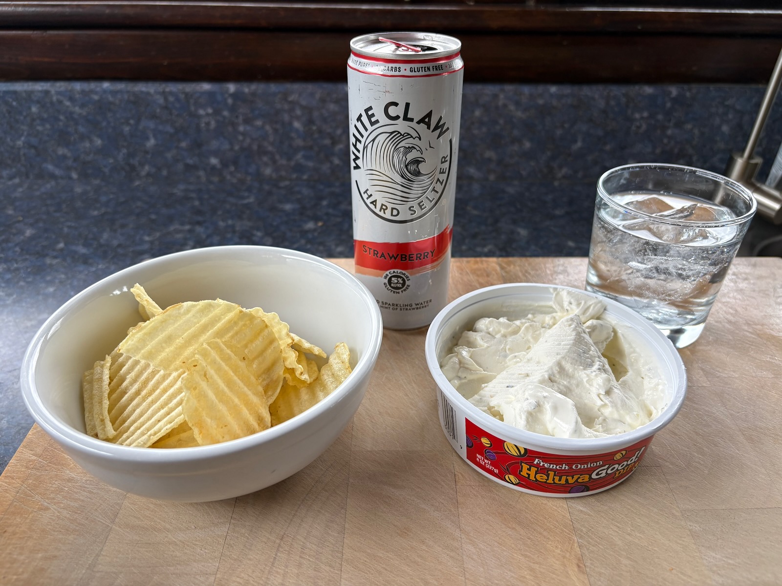 Snack: 1.0 oz. Wavy Lays potato chips with French onion dip. White Claw strawberry.