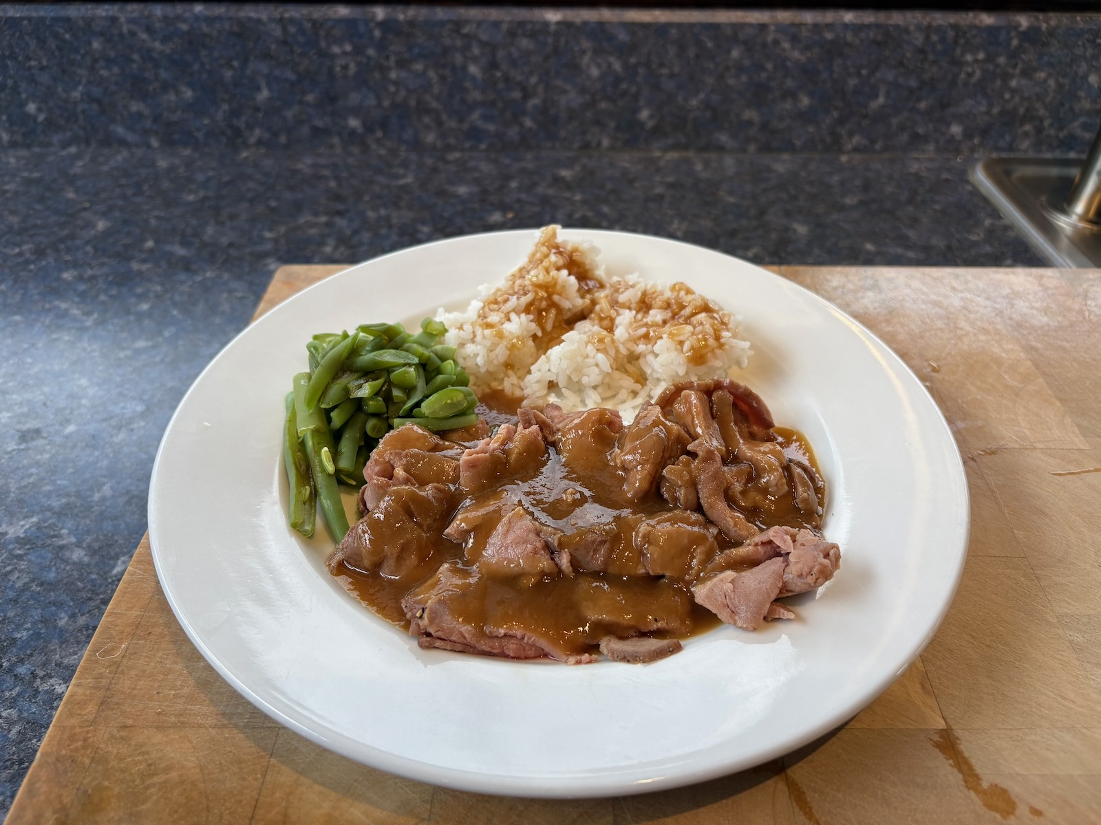 Dinner: Roast beef, rice, and gravy. With 4.0 oz. roast beef. Green beans (frozen). A half glass of Bota Box pinot noir.