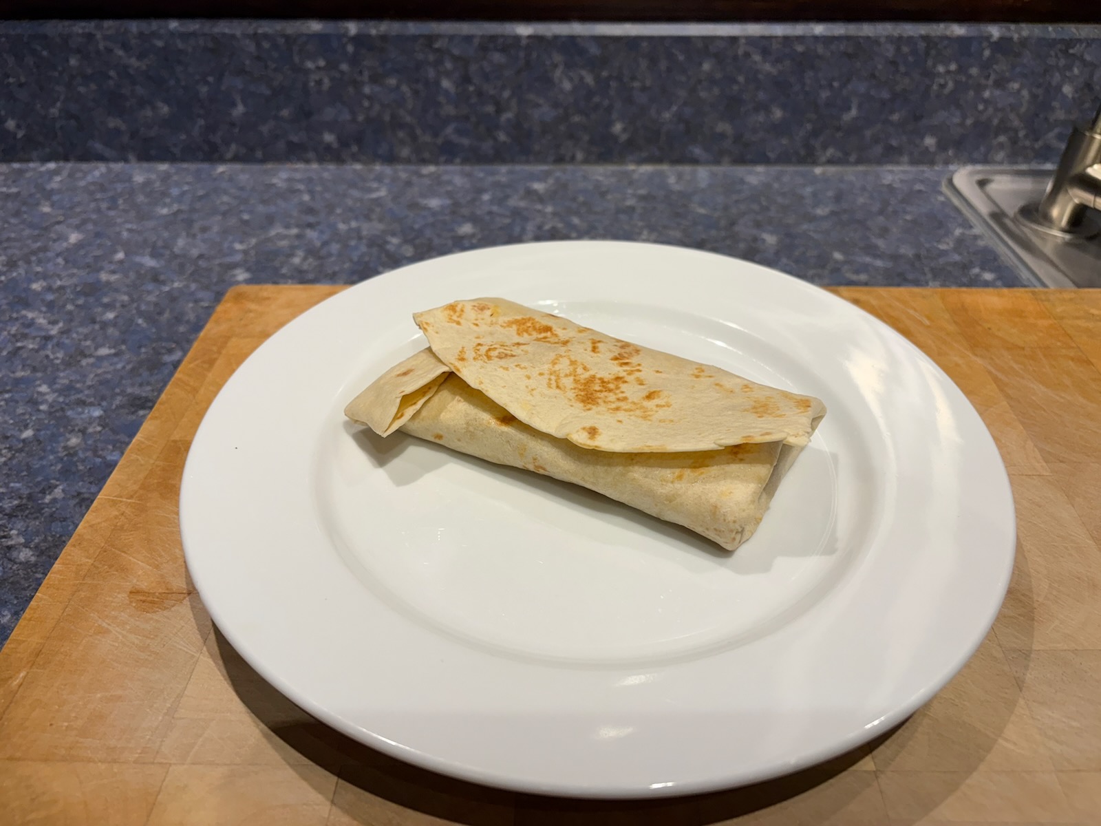 Breakfast: Chorizo breakfast burrito with chorizo, onion, green pepper, jalapeƱo, and egg. Reheat of the filling I cooked Saturday in a freshly heated flour tortilla.