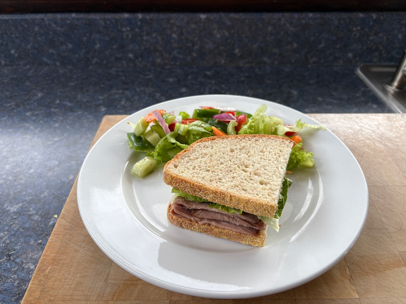 Lunch: Roast beef sandwich. With 2.4 oz. deli roast beef, lettuce, horseradish, and mayo on Heidelberg French peasant bread. Salad with lettuce mix, cucumber, tomato, carrot, celery, green pepper, red onion, and balsamic dressing.