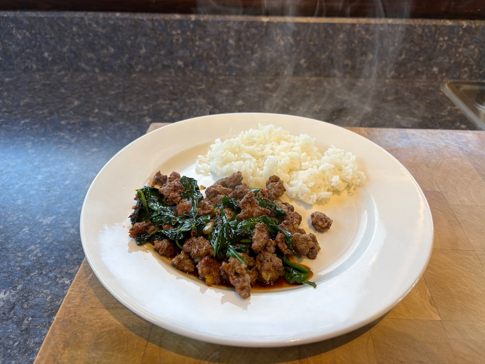 Dinner: Crushed hamburger (4.0 oz. before cooking) with spinach and rice. A half glass of Bota Box pinot noir.