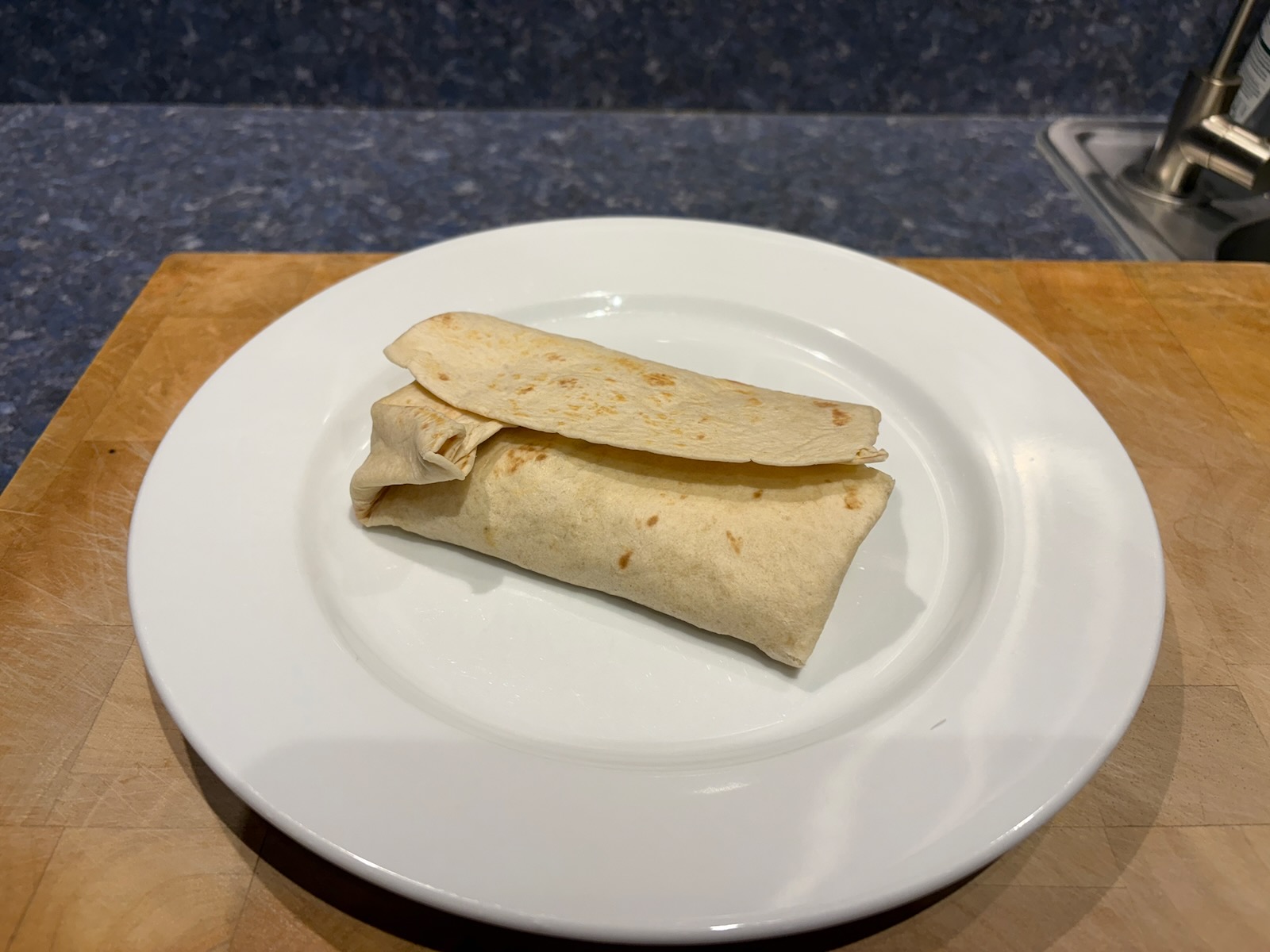 Breakfast: Chorizo breakfast burrito with chorizo, onion, green pepper, jalapeƱo, and egg. Reheat of the filling I cooked Saturday and froze, in a freshly heated flour tortilla.