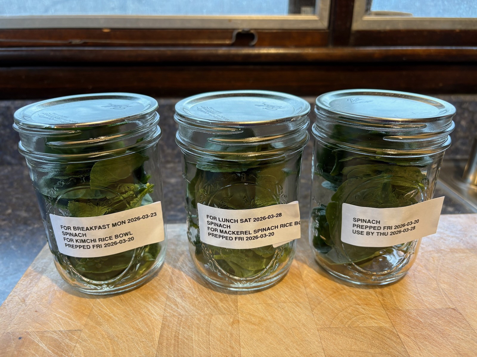 Prepped, vacuum sealed, and refrigerated jars of spinach.