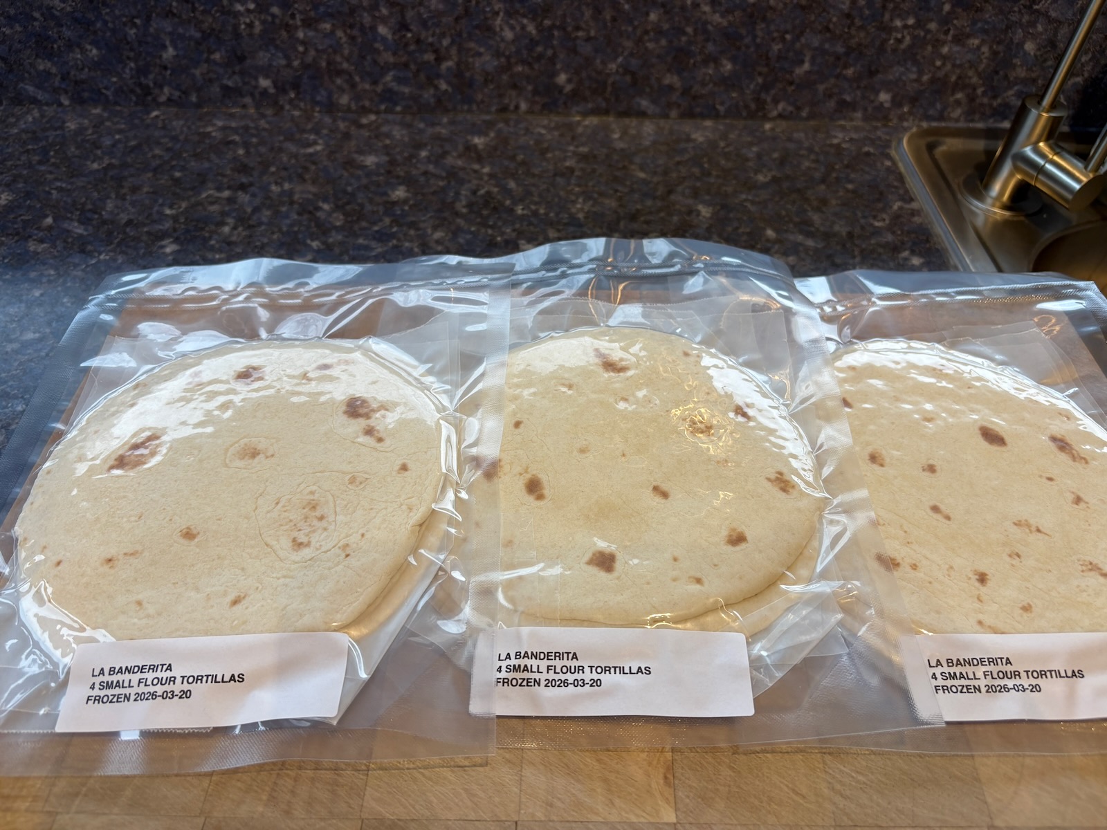 Divided a package of small flour tortillas. Vacuum sealed and froze 3 packages of 4 tortillas, separated by wax paper.