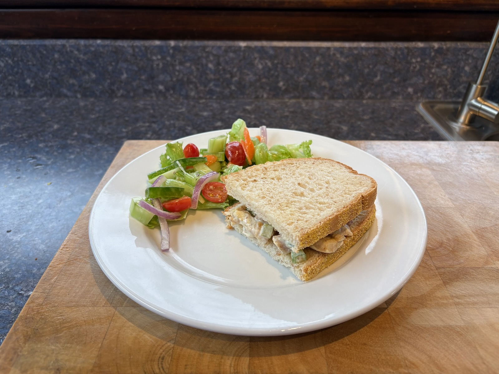Lunch: Curry chicken salad sandwich with 2.0 oz. chicken on Heidelberg French peasant bread. Side salad with lettuce mix, cucumber, tomato, celery, red onion, and Annie's green goddess dressing.