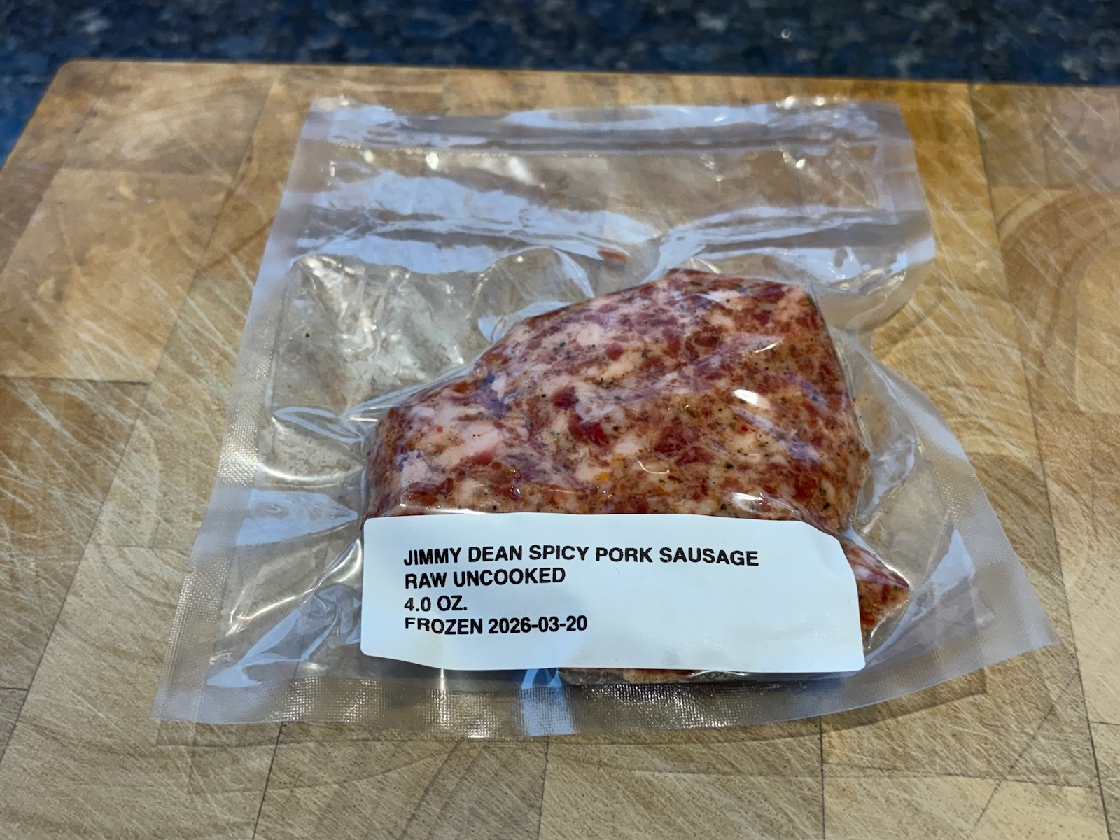 Prepared a batch of spicy pork breakfast sausage for sausage, egg, and cheese. From a 16 oz. tube of Jimmy Dean hot loose sausage, separated out 4 oz., vacuum sealed, and froze raw. Used the rest to make sausage patties, 2.0 oz. each (weight before cooking).