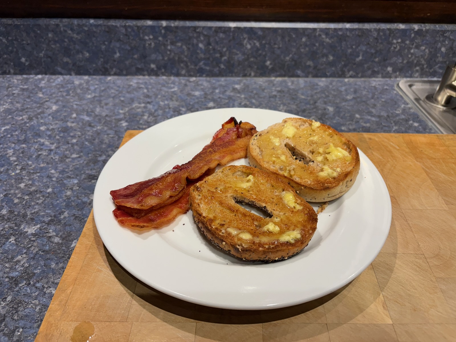 Breakfast: Toasted everything bagel with butter. Side of bacon.