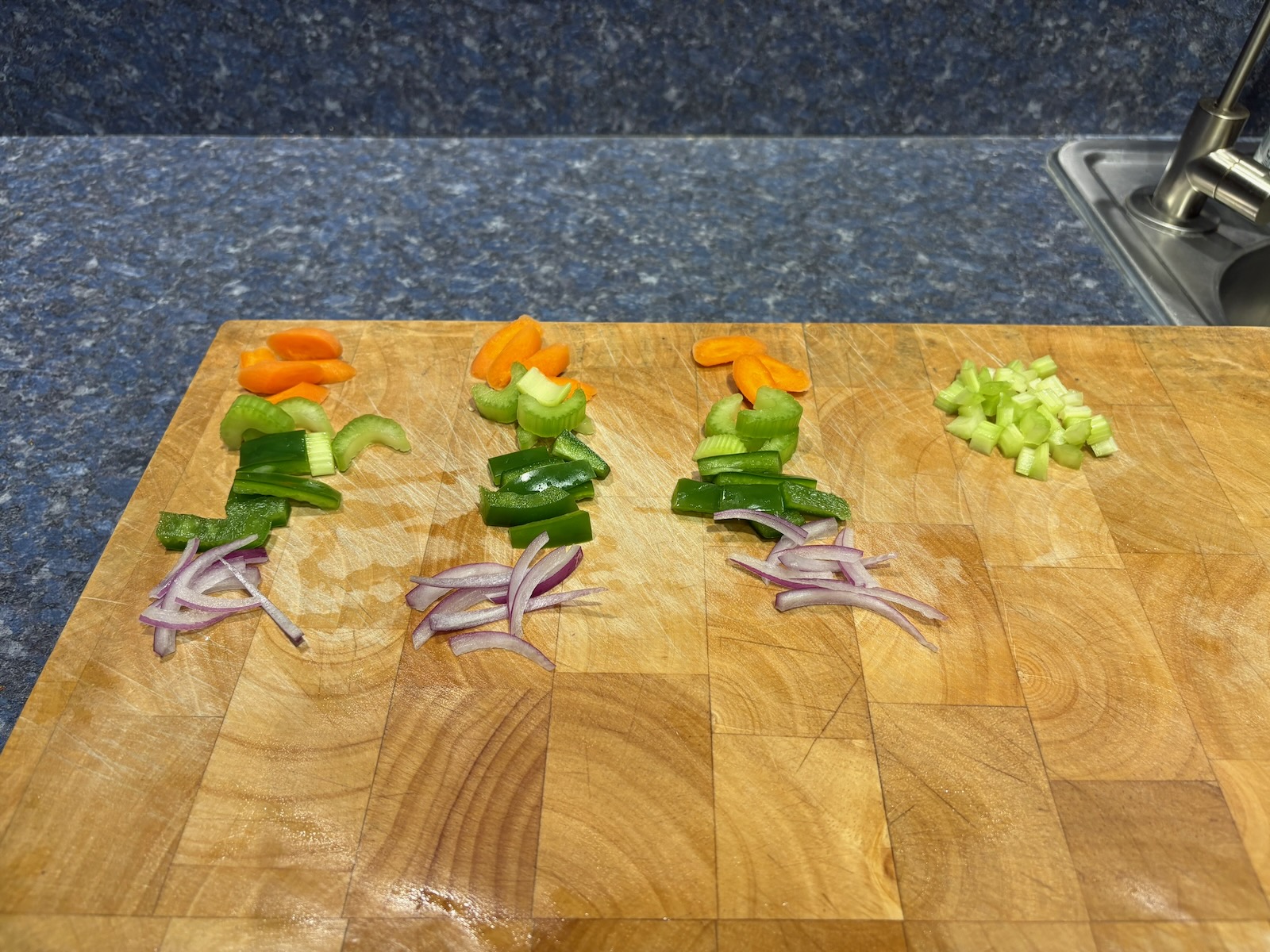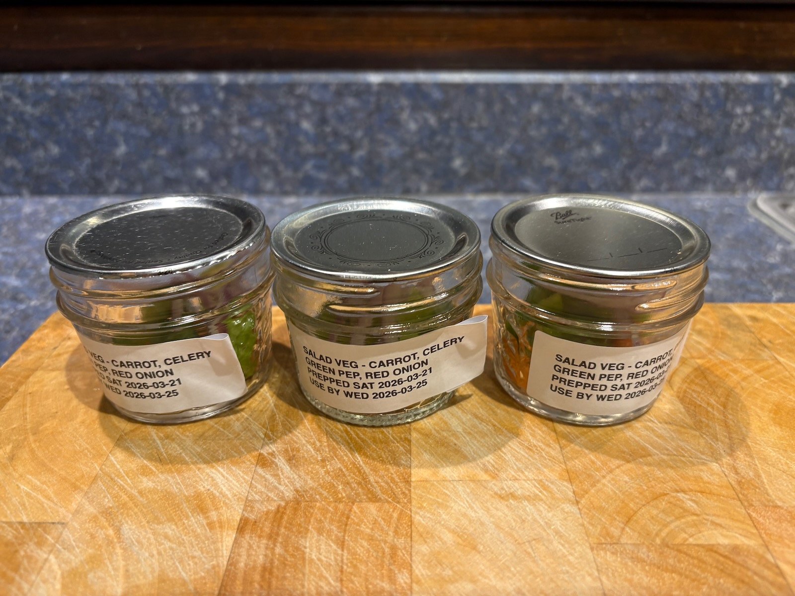 Prepped 3 servings of salad veggies. With carrot, celery, green pepper, red onion.