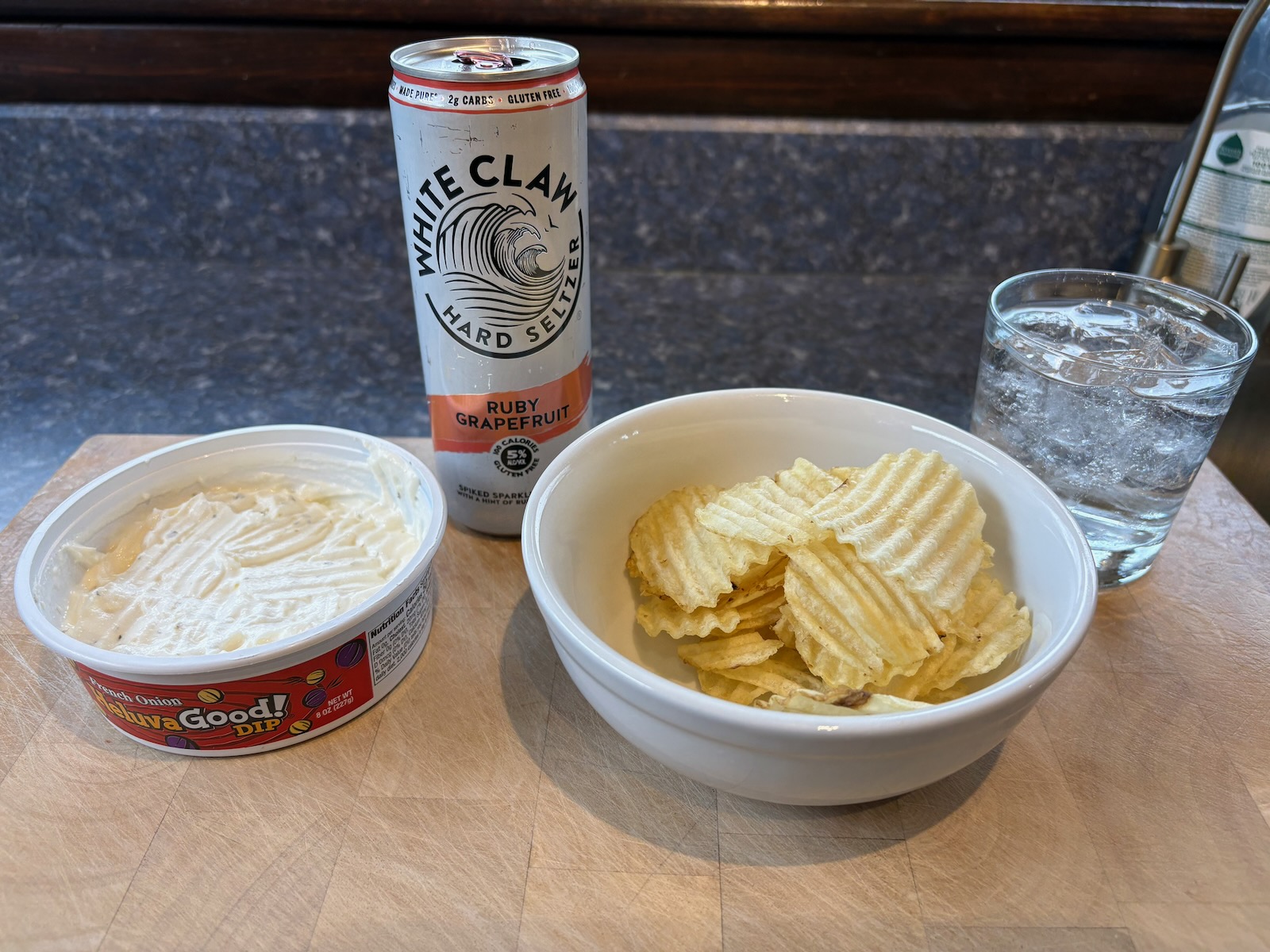 Snack: 2.0 oz. potato chips with French onion dip. White Claw grapefruit.