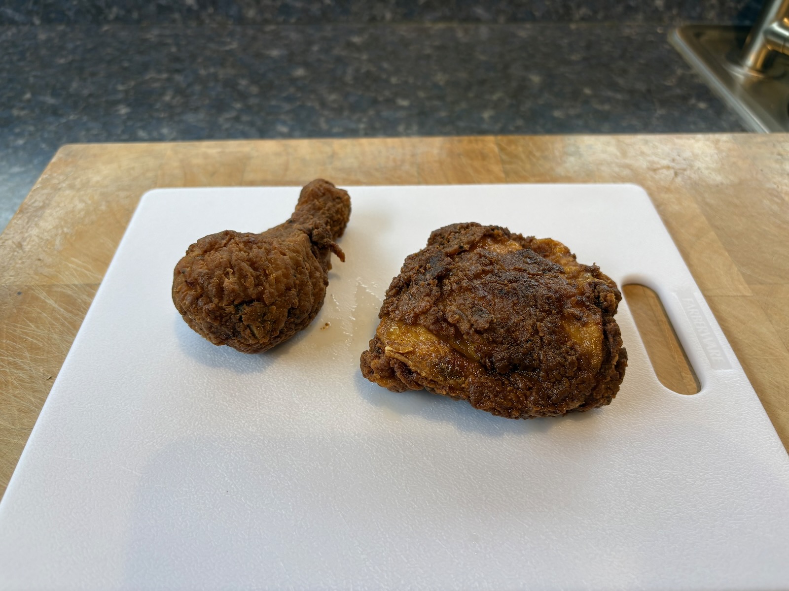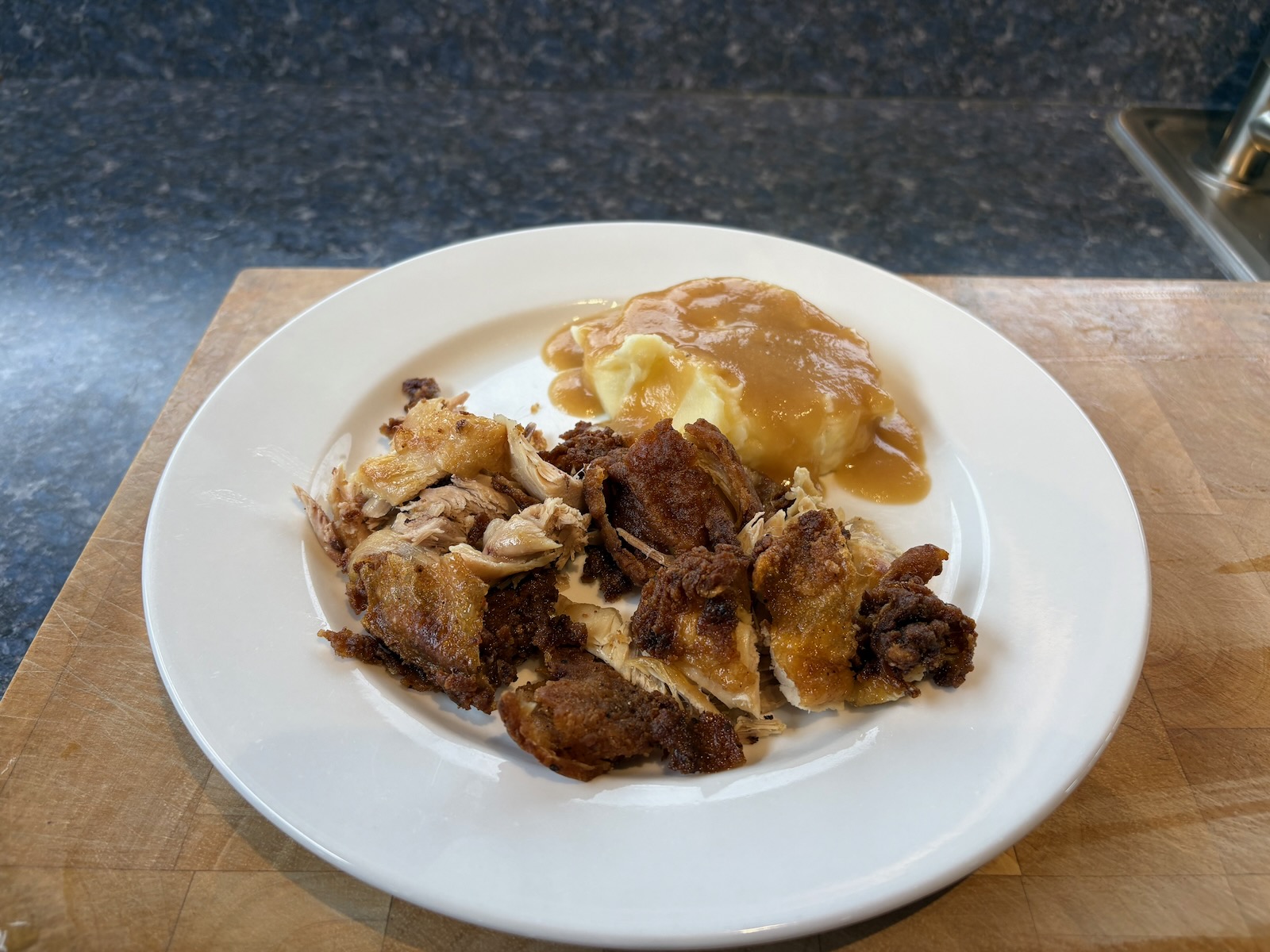 Dinner: Fried chicken, mashed potatoes, and gravy. A half glass of Bota Box pinot noir.
