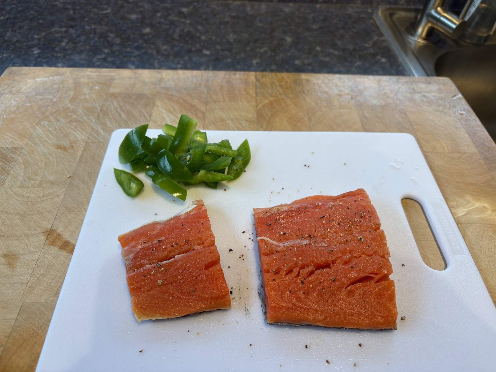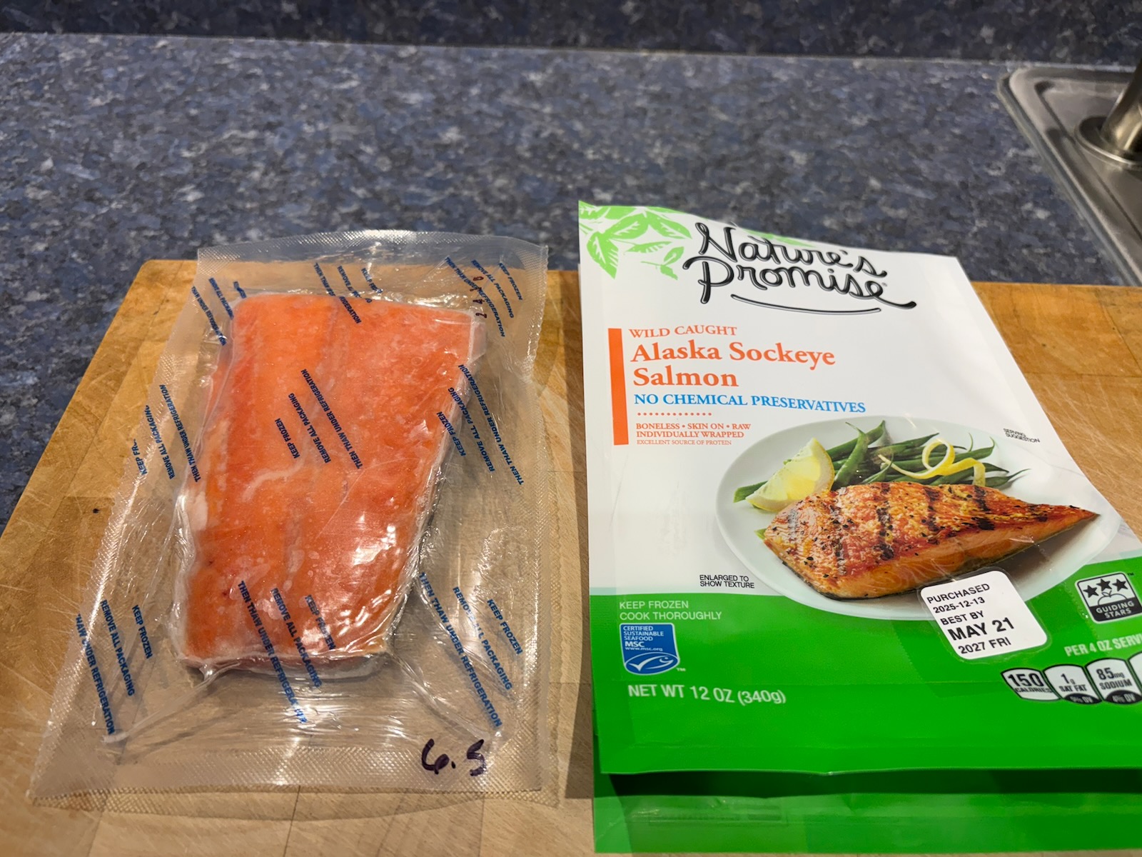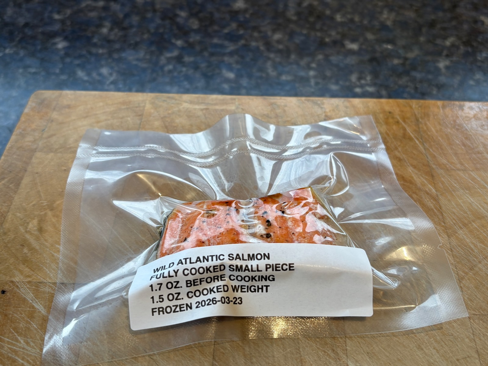 Divided the 6.5 oz. salmon into two servings, one 4.2 oz. piece for dinner tonight, and a small 1.7 oz. piece for a future meal. It's a little small for Salmon BLT but it might be good for Salmon and eggs stir-fry.