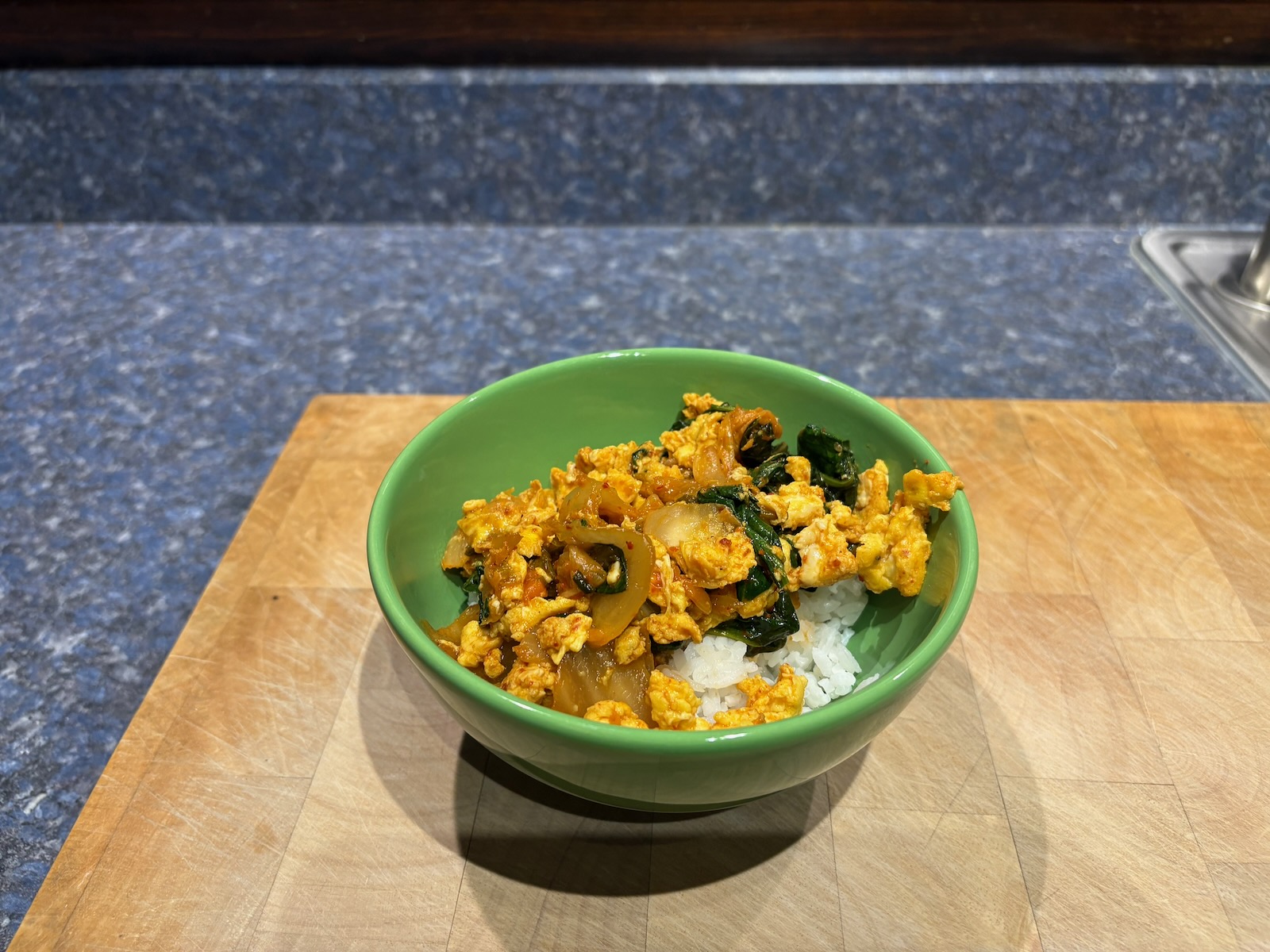 Breakfast: Kimchi scrambled eggs on a bed of rice.