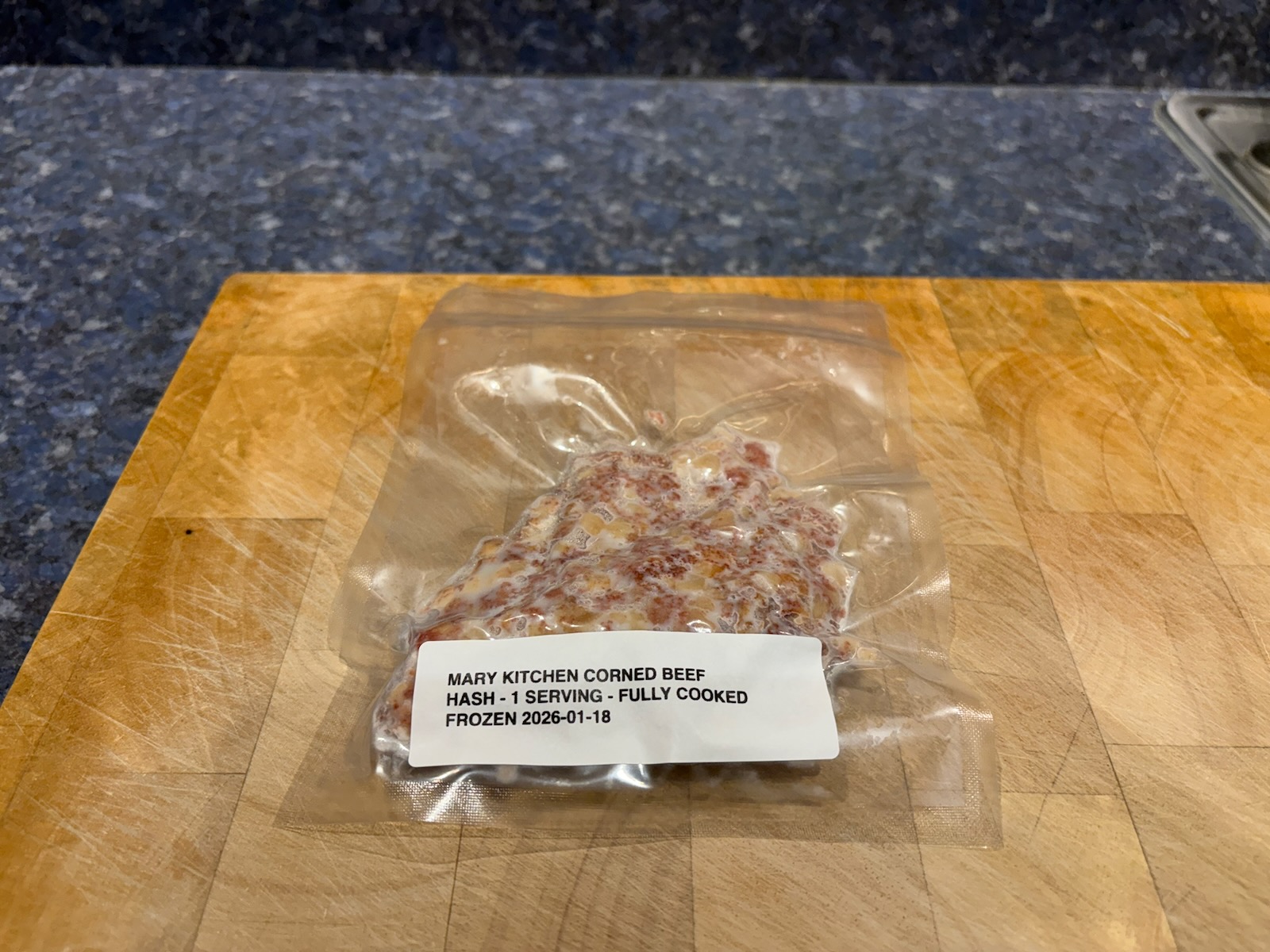 Defrosted corned beef hash for breakfast tomorrow.