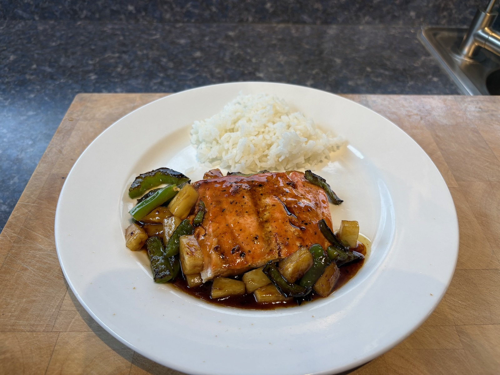 Dinner: Teriyaki salmon. With 4.1 oz. salmon. Green peppers. A half glass of Bota box sauvignon blanc.