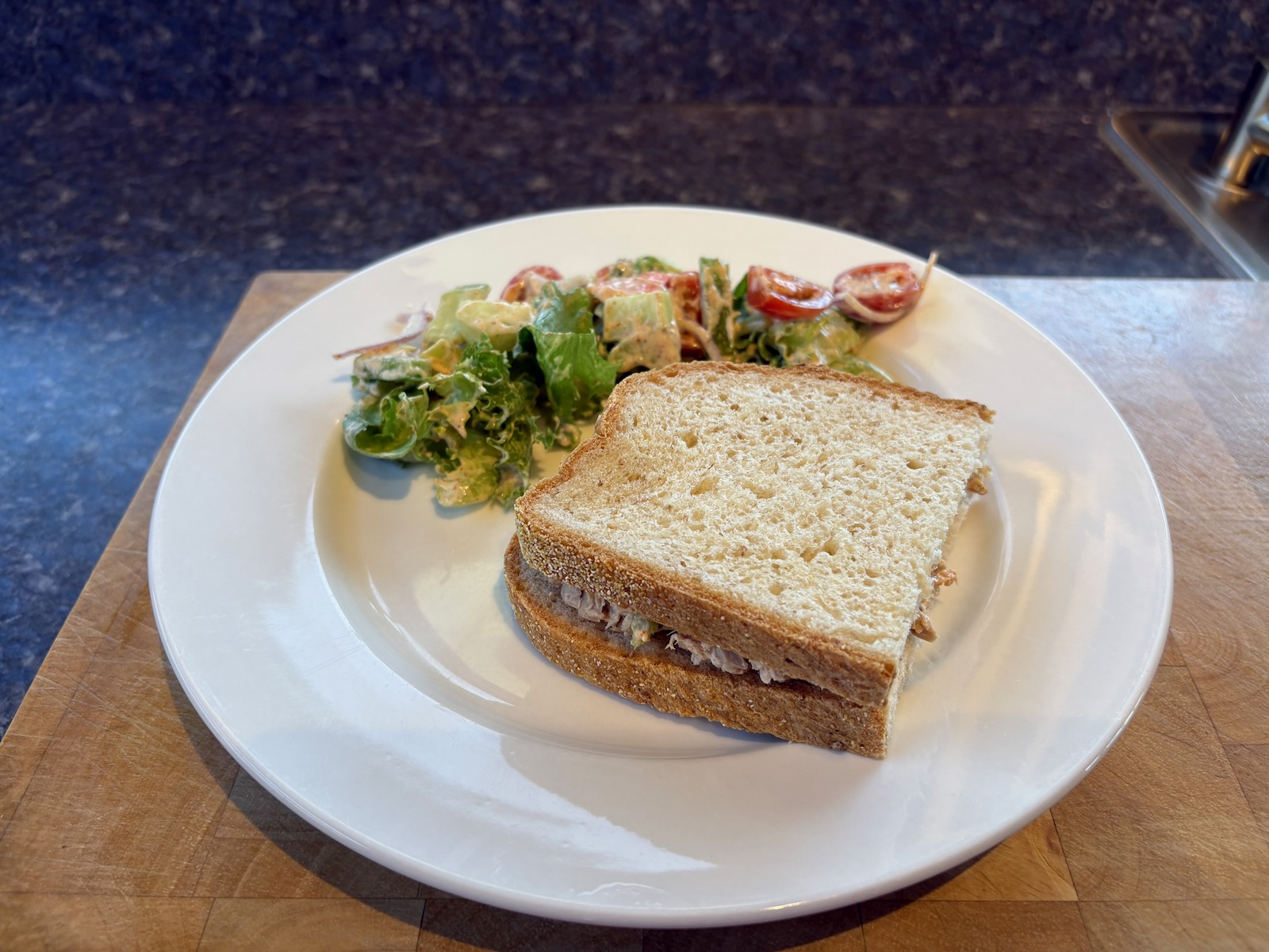 Lunch: Spicy tuna salad sandwich on Heidelberg French peasant bread. Salad with lettuce mix, cucumber, tomato, carrot, celery, green pepper, red onion, and chipotle ranch dressing (20 grams, 93 cal).
